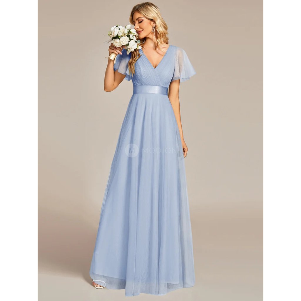 Společenské šaty ledově modré dlouhé tylové s krátkým rukávem a áčkovým střihem – Ever Pretty EP07962IB