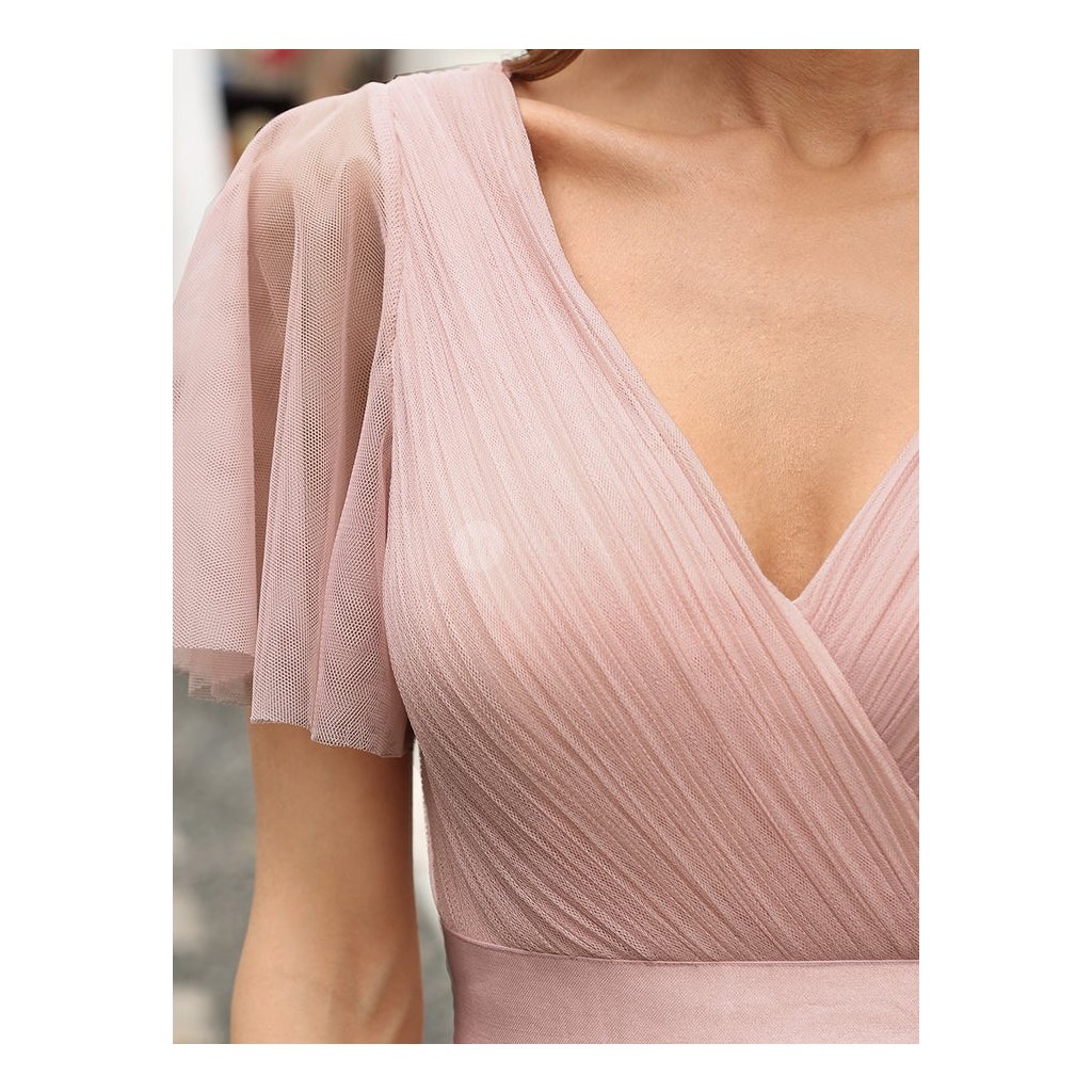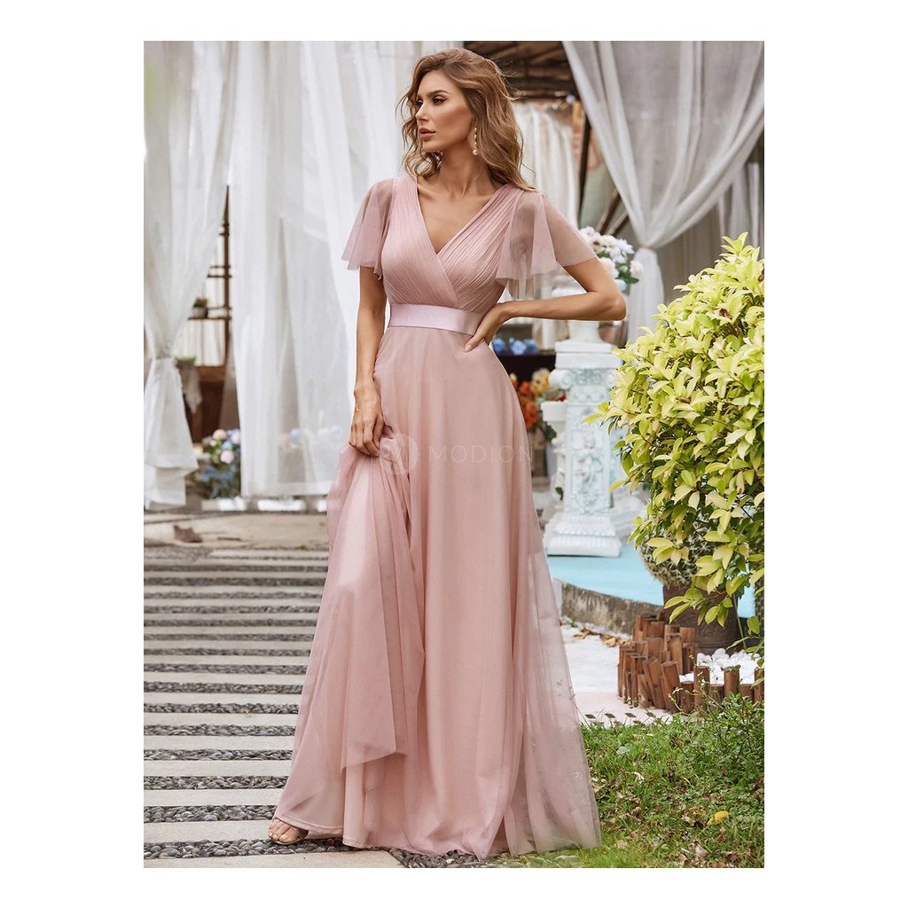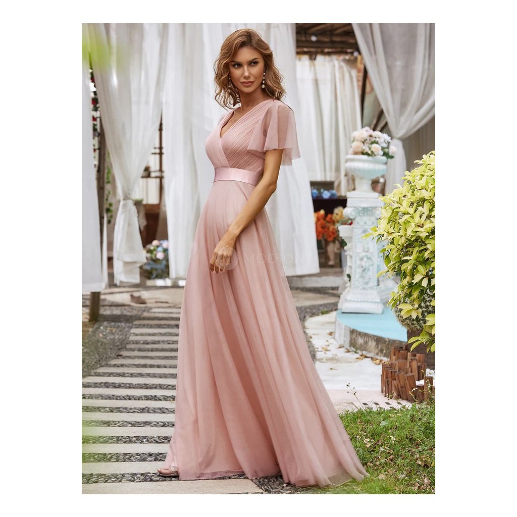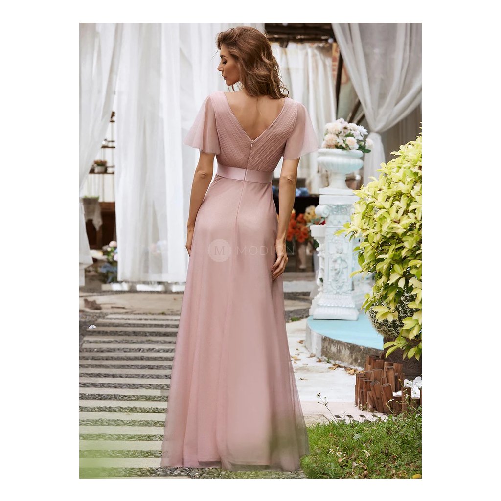 V růžových tylových šatech se budete cítit jemně a romanticky, áčkový střih a výstřih do V podtrhnou vaši ženskost a eleganci.