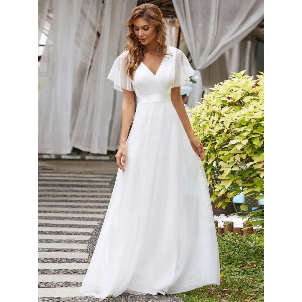 Bílé společenské šaty z jemného tylu působí čistě, elegantně a velmi slavnostně. Lehký tyl dodává vzdušnost a jemnost, střih do áčka lichotí postavě a umožňuje volný pohyb. Výstřih do V opticky prodlužuje siluetu, zatímco krátké rukávy z tylu decentně zakrývají paže. Splývavá áčková sukně podtrhuje romantický a vznešený charakter šatů.