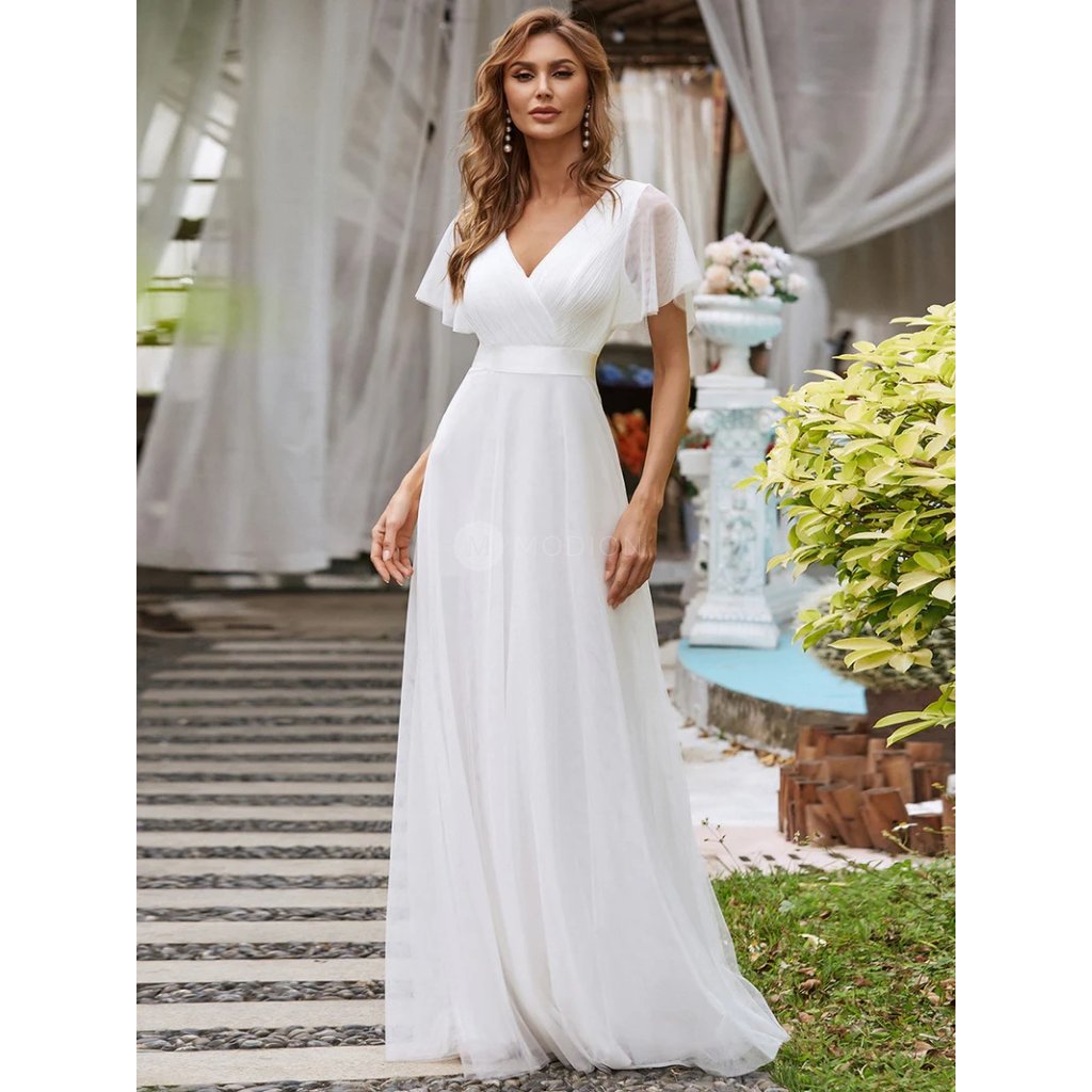 Svatební šaty Elodie: Bílé šaty s V-výstřihem a vzdušnými rukávy. Ideální šaty na svatbu, obřad i pro nevěsty na převlečení.