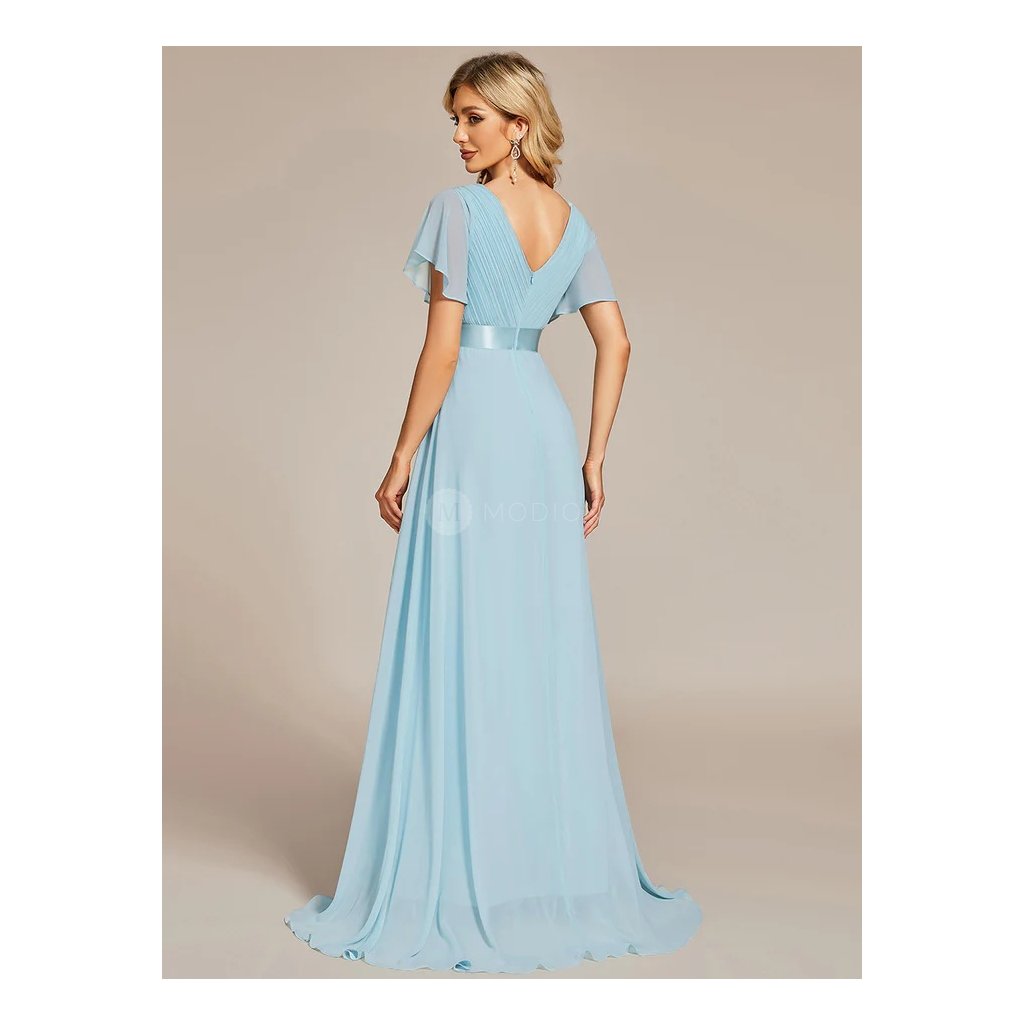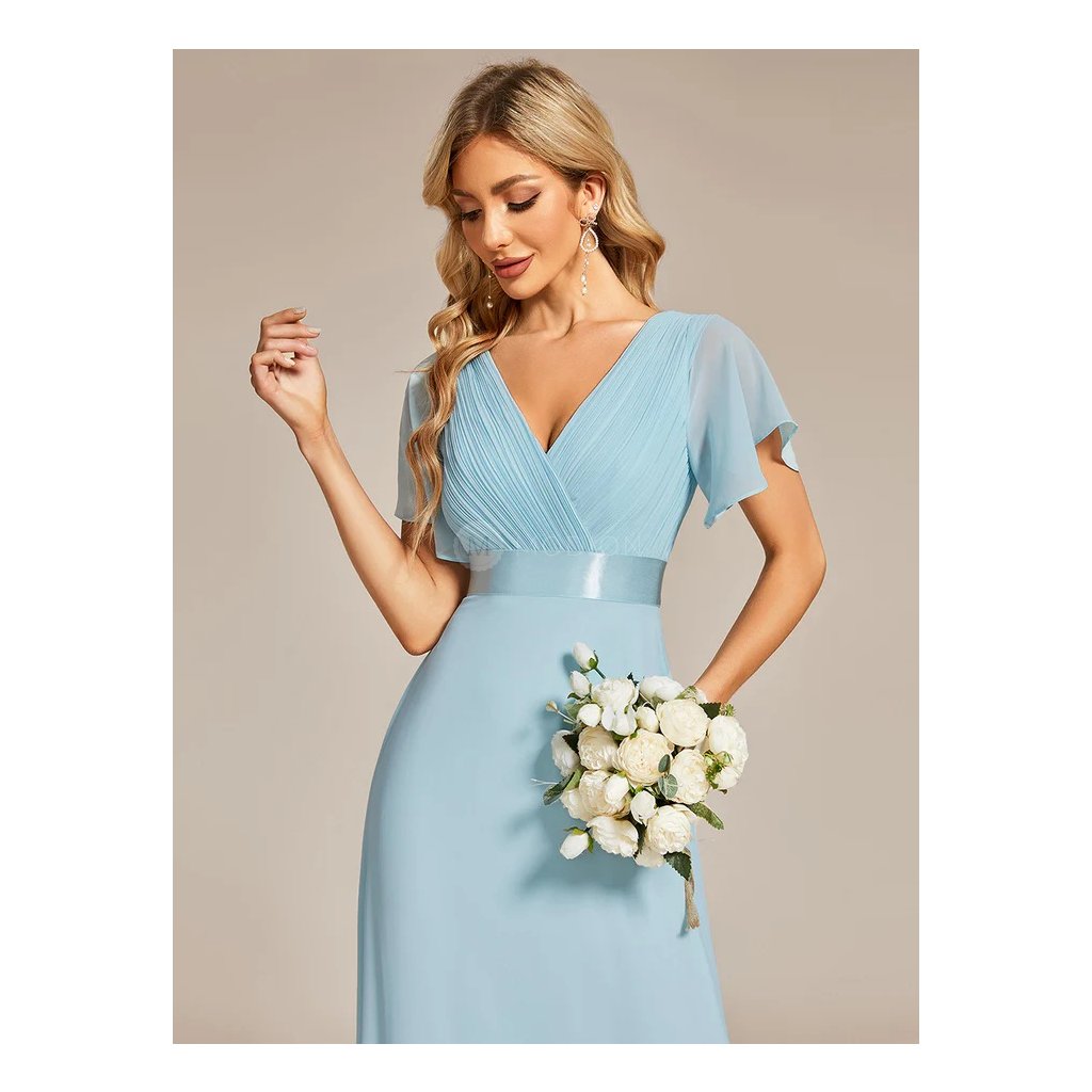 Bleděmodré společenské šaty z jemného šifonu působí svěže a étericky. Elegantní střih s výstřihem do V prodlužuje krk a zvýrazňuje dekolt, zatímco plisovaný živůtek dodává šatům noblesní strukturu. Vysoký empírový pas lichotí postavě a přechází do vzdušné áčkové sukně, která se při pohybu ladně vlní. Krátké rukávy decentně zakrývají ramena a přispívají k harmonickému vzhledu. Bleděmodrý odstín je ideální na plesy, svatby, galavečery i další slavnostní události.