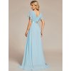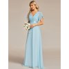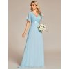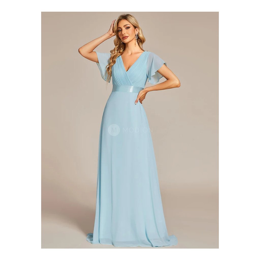 Bleděmodré společenské šaty z jemného šifonu působí svěže a étericky. Elegantní střih s výstřihem do V prodlužuje krk a zvýrazňuje dekolt, zatímco plisovaný živůtek dodává šatům noblesní strukturu. Vysoký empírový pas lichotí postavě a přechází do vzdušné áčkové sukně, která se při pohybu ladně vlní. Krátké rukávy decentně zakrývají ramena a přispívají k harmonickému vzhledu. Bleděmodrý odstín je ideální na plesy, svatby, galavečery i další slavnostní události.