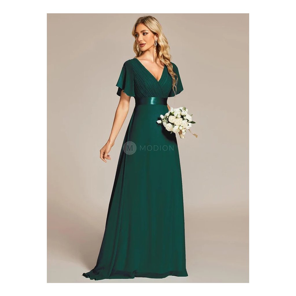 Tmavě zelené smaragdové společenské šaty z šifonu okouzlí hlubokým elegantním odstínem a nadčasovým střihem, který lichotí ženské postavě. Výstřih do V opticky prodlužuje krk a zvýrazňuje dekolt, zatímco plisovaný živůtek dodává šatům noblesní vzhled. Vysoký empírový pas krásně formuje siluetu a plynule přechází do splývavé áčkové sukně, která se při chůzi lehce vlní. Krátké rukávy decentně zakrývají ramena a harmonicky doplňují celkový vzhled. Smaragdově zelená barva působí výrazně, přesto vkusně – ideální na plesy, večírky, galavečery i svatby.