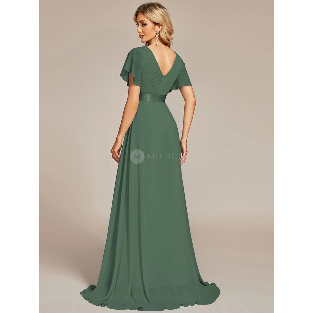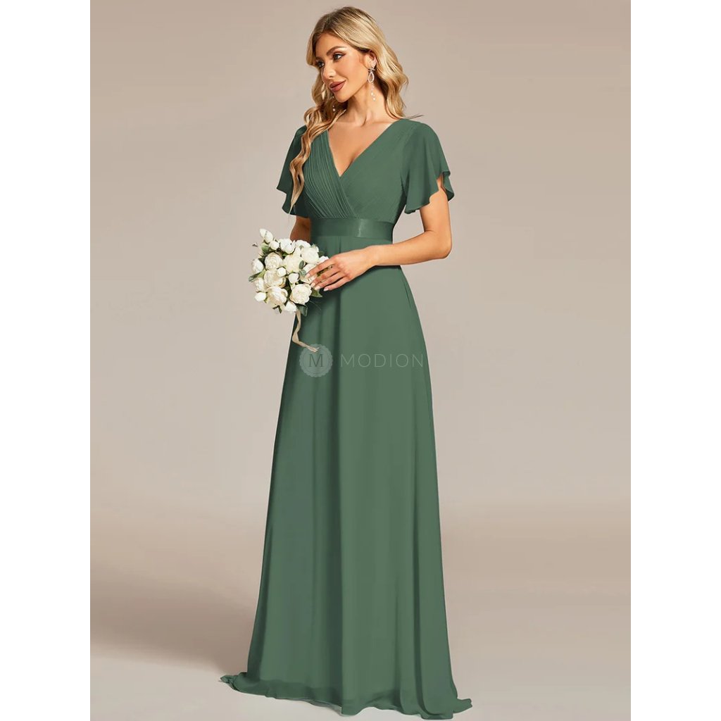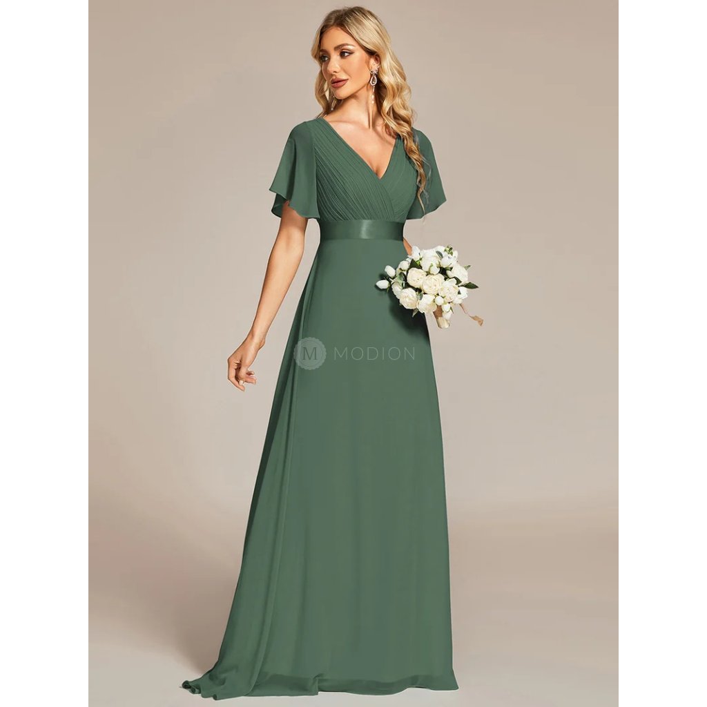 Zelené eukalyptové společenské šaty z jemného šifonu působí svěže, elegantně a velmi žensky. Výstřih do V opticky prodlužuje krk a zvýrazňuje dekolt, zatímco plisovaný živůtek dodává šatům jemný noblesní detail. Vysoký empírový pas krásně zvýrazní siluetu a plynule přechází do vzdušné áčkové sukně, která se při chůzi ladně vlní. Krátké rukávy decentně zakrývají ramena a podtrhují harmonii celého střihu.