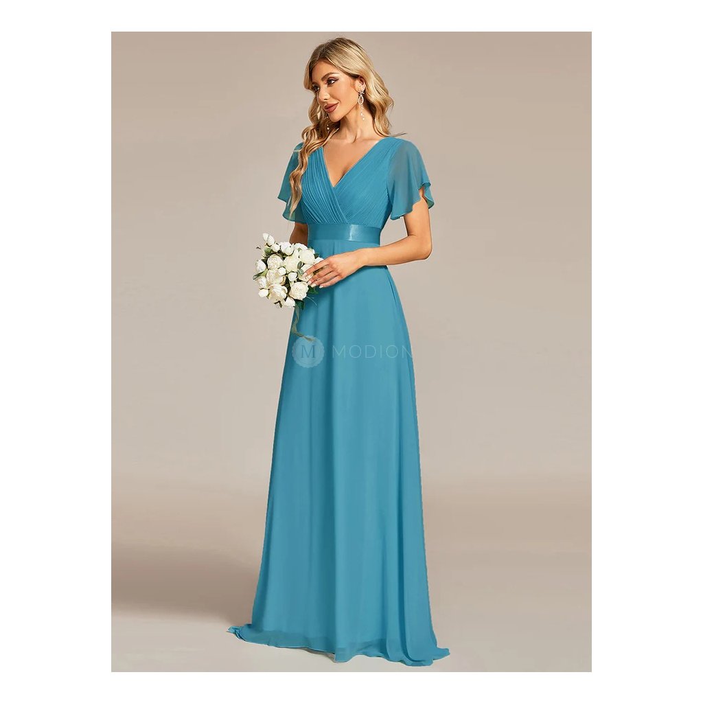 Nefritově modré společenské šaty z šifonu zaujmou výraznou, elegantní barvou a střihem, který lichotí ženské postavě. Výstřih do V opticky prodlužuje krk a zdůrazňuje dekolt, zatímco plisovaný živůtek dodává modelu jemnou strukturu a noblesní vzhled. Empírový pas zvýrazní siluetu a přechází do áčkové sukně z lehkého šifonu, která se při chůzi ladně vlní. Krátké rukávy decentně zakrývají ramena a dotvářejí harmonický dojem. Nefritově modrý odstín působí ušlechtile, elegantně a slavnostně – ideální volba na ples, svatbu, galavečer i další společenské události.