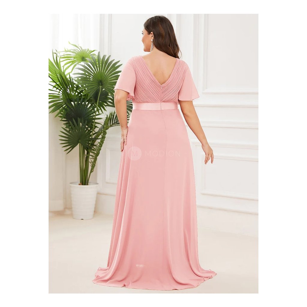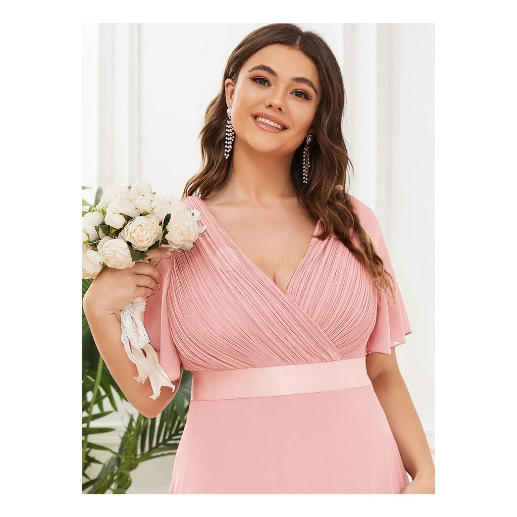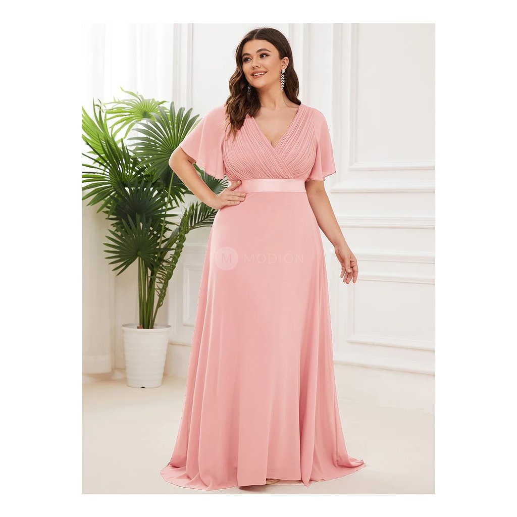 Růžové společenské šaty z lehkého šifonu okouzlí jemným odstínem a střihem, který lichotí plnoštíhlé postavě. Výstřih do V opticky prodlužuje krk a půvabně zvýrazňuje dekolt, zatímco plisovaný živůtek dodává modelu strukturu a nádech noblesy. Vysoký empírový pas krásně zvýrazní siluetu a přechází do splývavé áčkové sukně, která se při chůzi ladně pohybuje. Krátké rukávy jemně zakrývají ramena a vytvářejí vyvážený celek.