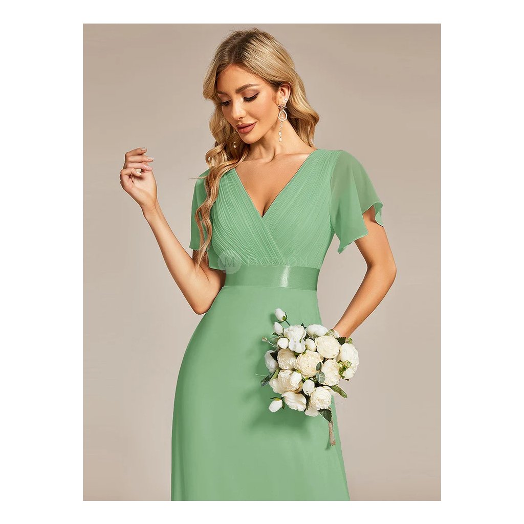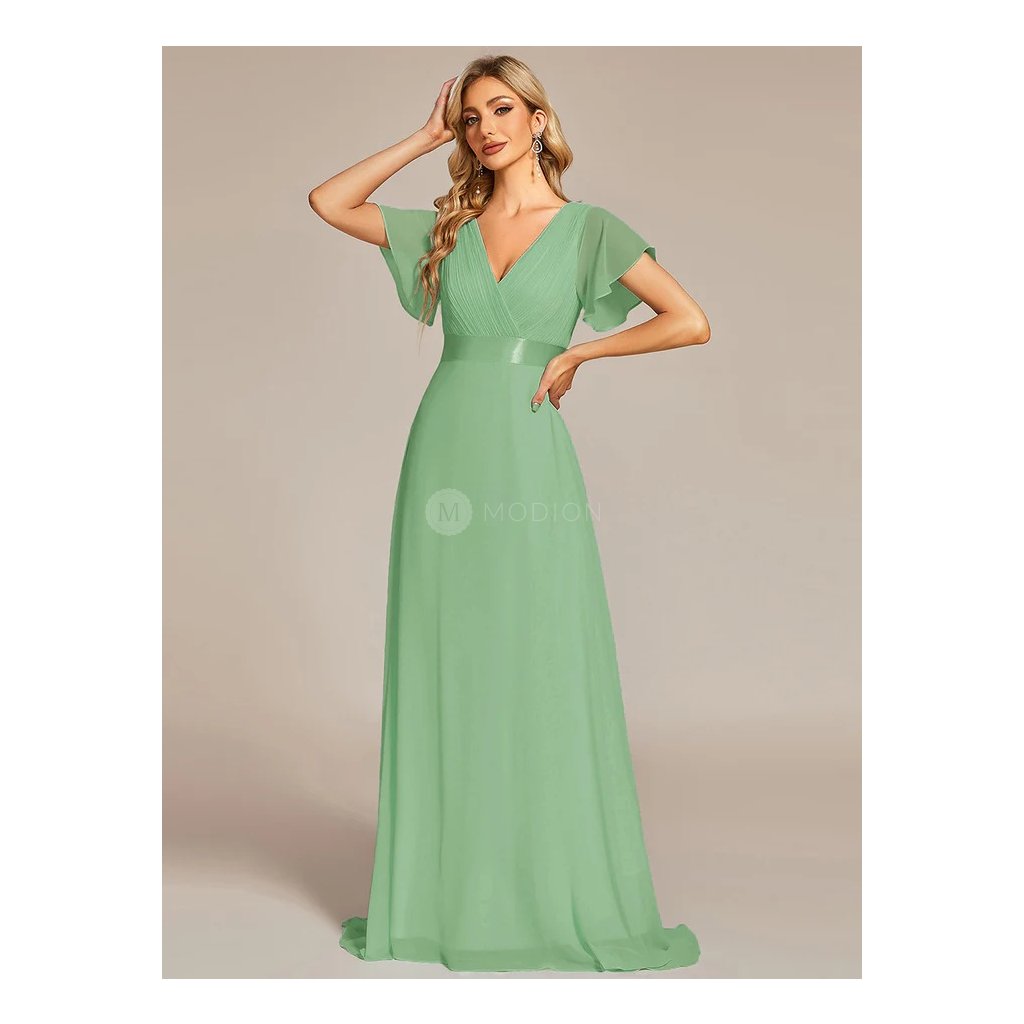 Zelenkavé společenské šaty z lehkého šifonu zaujmou jemným odstínem a nadčasovým střihem, který lichotí ženské postavě. Výstřih do V opticky prodlužuje krk a decentně zvýrazňuje dekolt, zatímco plisovaný živůtek dodává modelu sofistikovaný vzhled. Vysoký empírový pas krásně tvaruje siluetu a přechází do lehce splývavé áčkové sukně, která se při pohybu ladně vlní. Krátké rukávy jemně kryjí ramena a přispívají k celkové harmonii modelu. Zelenkavá barva působí svěže, přirozeně a elegantně – ideální na plesy, svatby, galavečery a další slavnostní příležitosti.