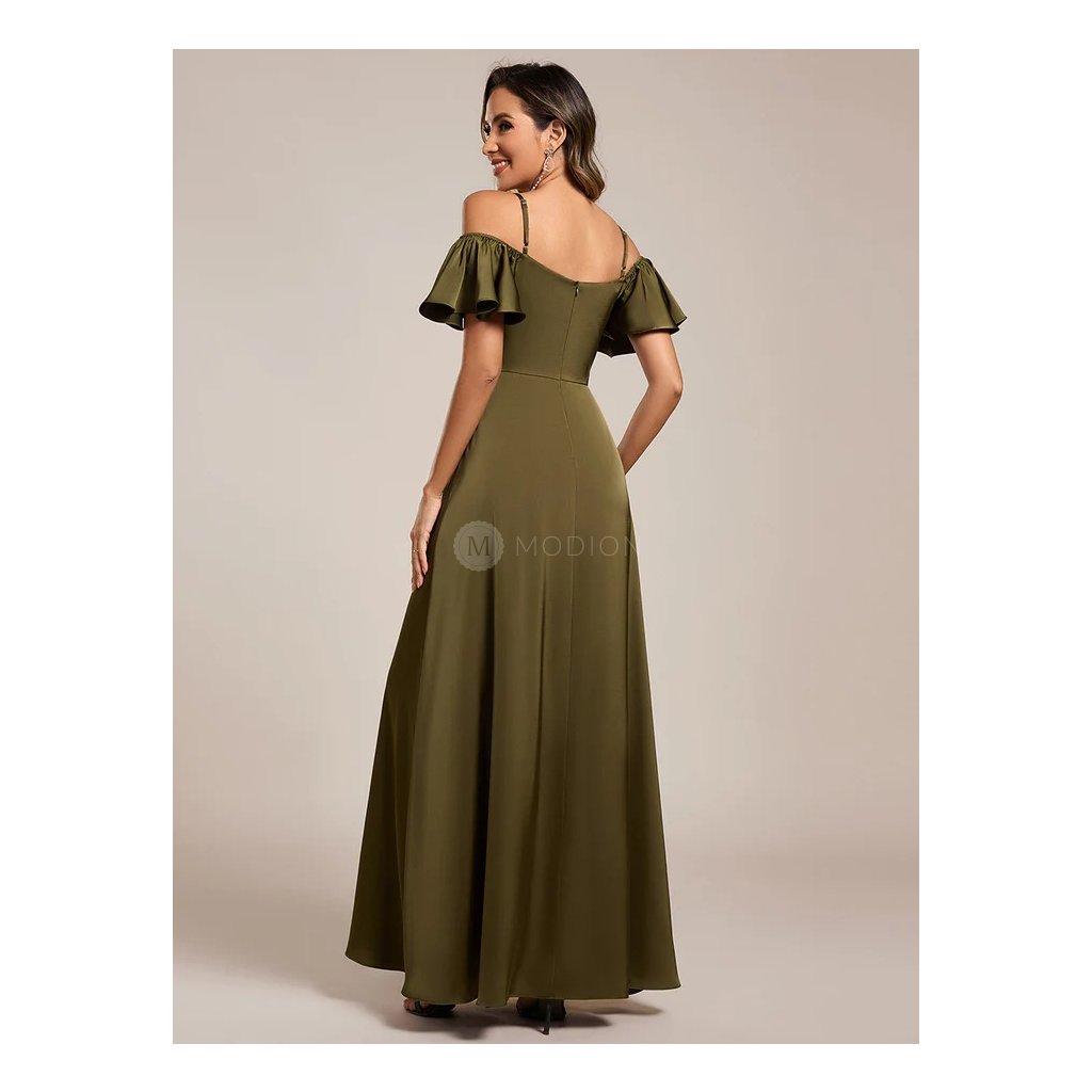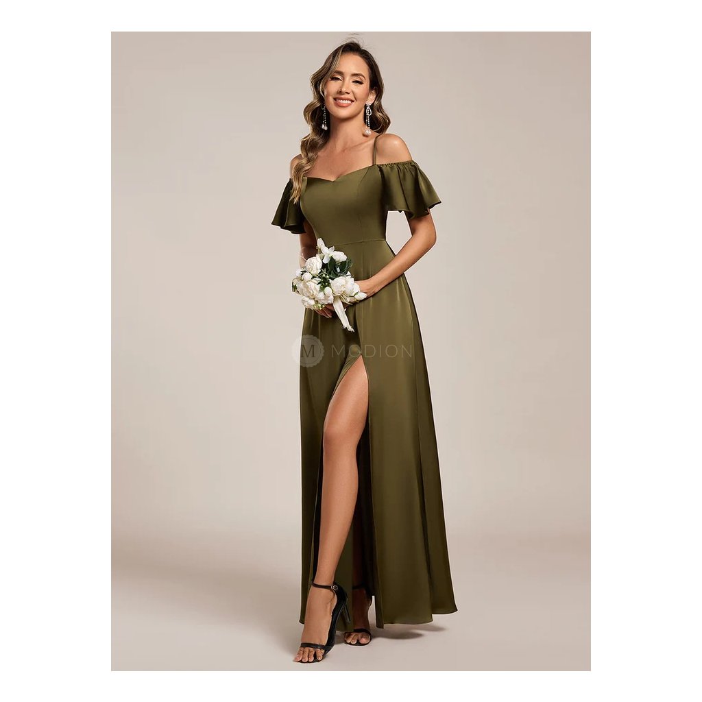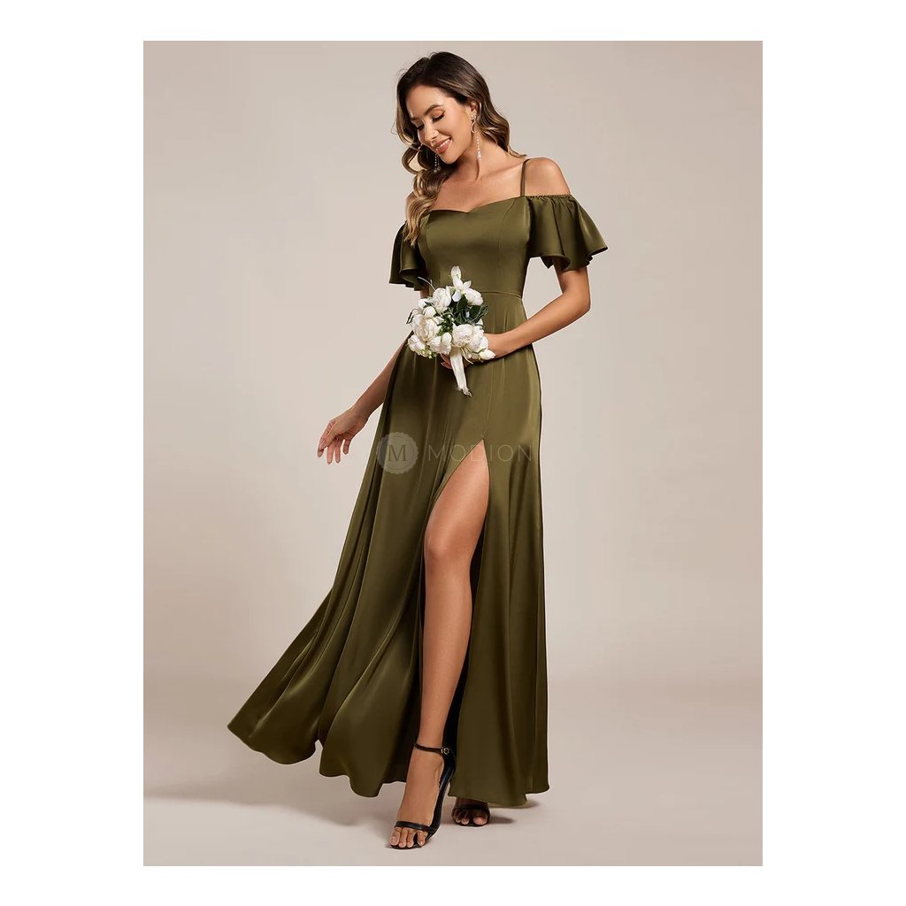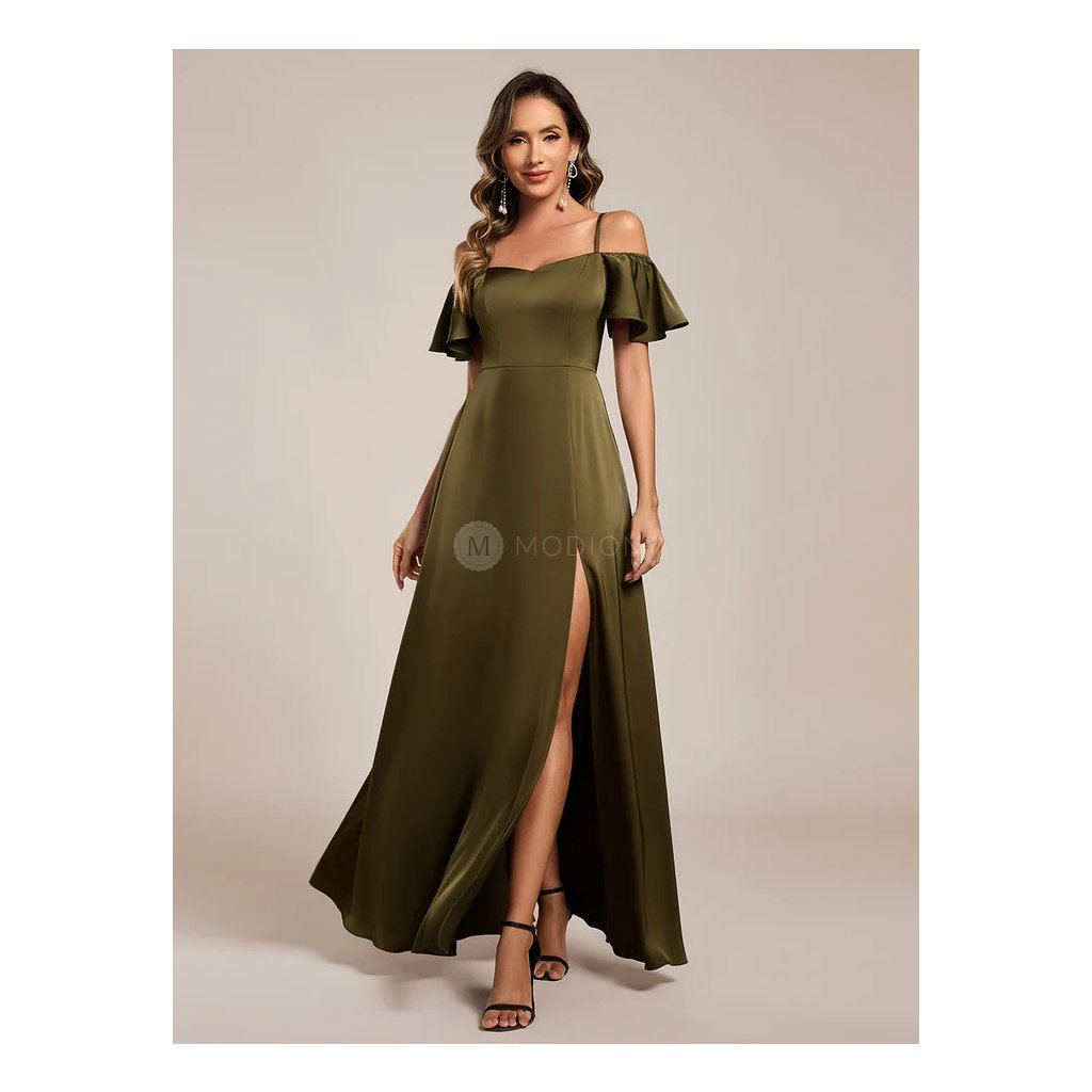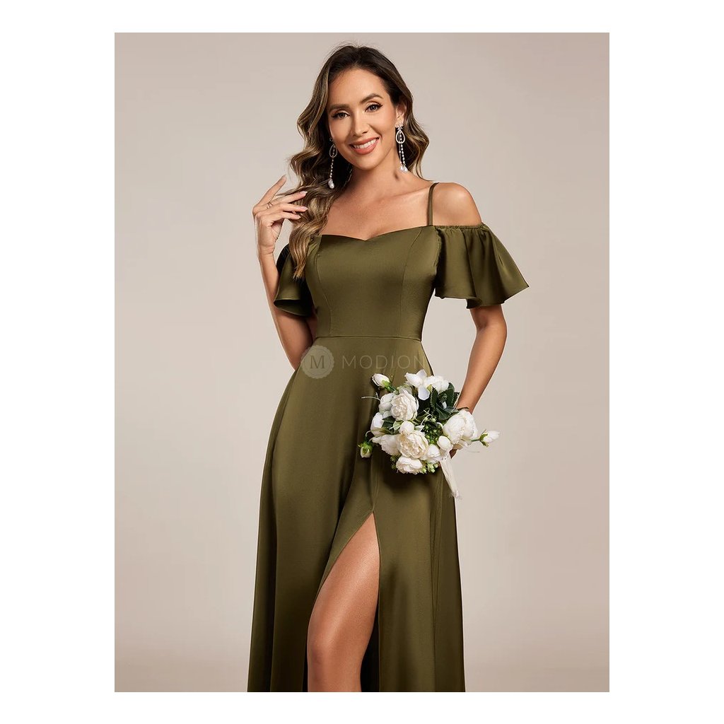 Olivově zelené saténové společenské šaty působí smyslně a zároveň elegantně. Hladký satén krásně splývá, zvýrazní postavu a dodá šatům luxusní vzhled. Model je doplněn tenkými ramínky a spadenými rukávy, které dodávají jemně romantický nádech. Dlouhá sukně s vysokým rozparkem působí odlehčeně a umožňuje volný pohyb.