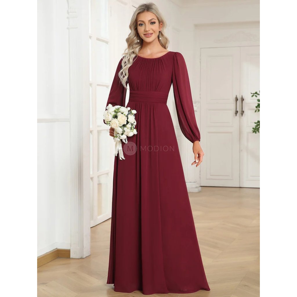Dlouhé vínově červené společenské šaty z lehkého šifonu s dlouhým rukávem působí elegantně, slavnostně a velmi žensky. Jsou ideální volbou pro ženy, které hledají decentní, ale reprezentativní model vhodný i pro formálnější a večerní události.