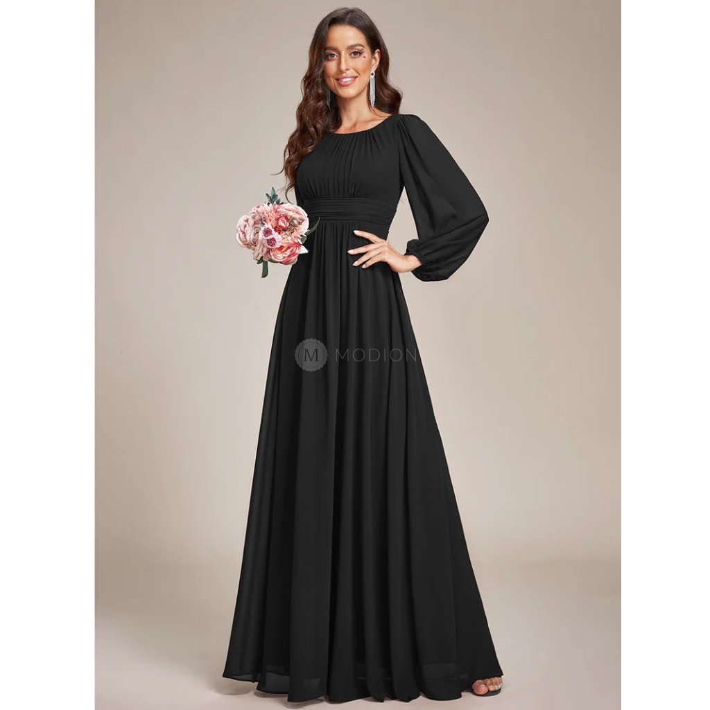 Dlouhé černé společenské šaty z lehkého šifonu s dlouhými rukávy působí elegantně, nadčasově a velmi žensky. Jsou ideální volbou pro ženy, které hledají decentní a sofistikovaný model vhodný pro slavnostní i formálnější události.