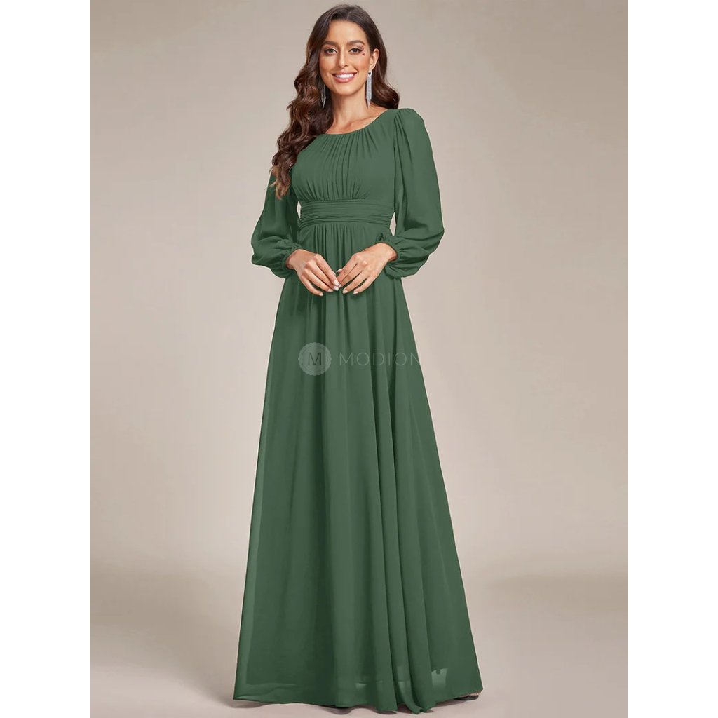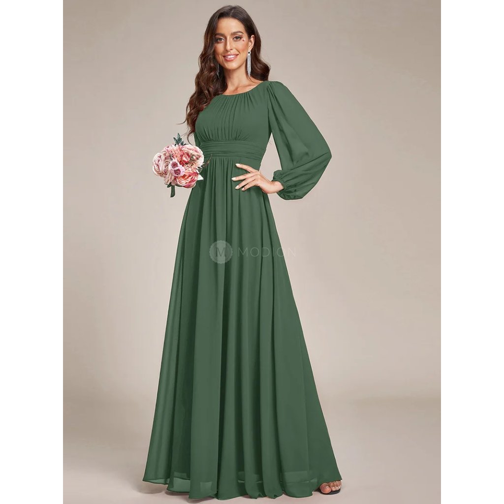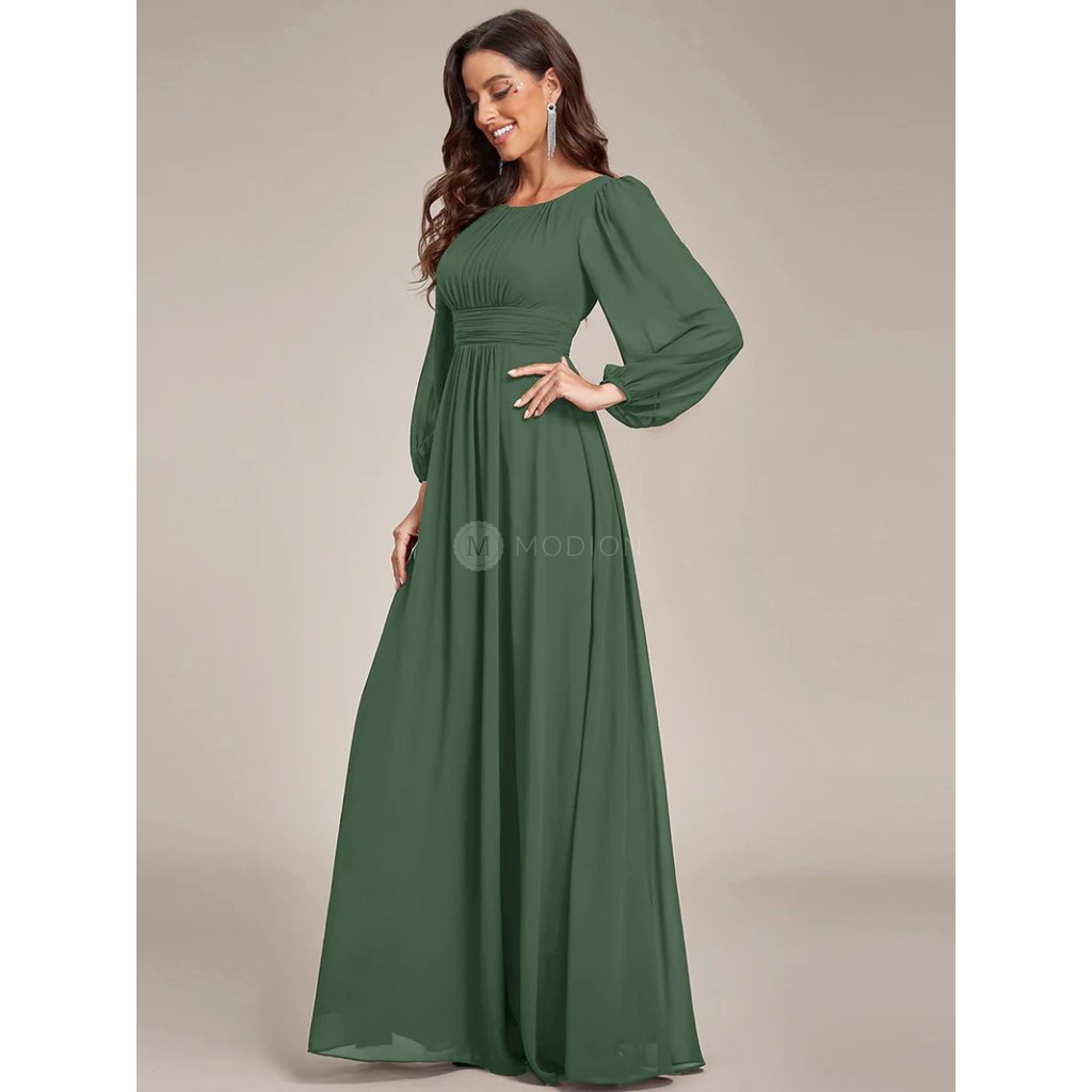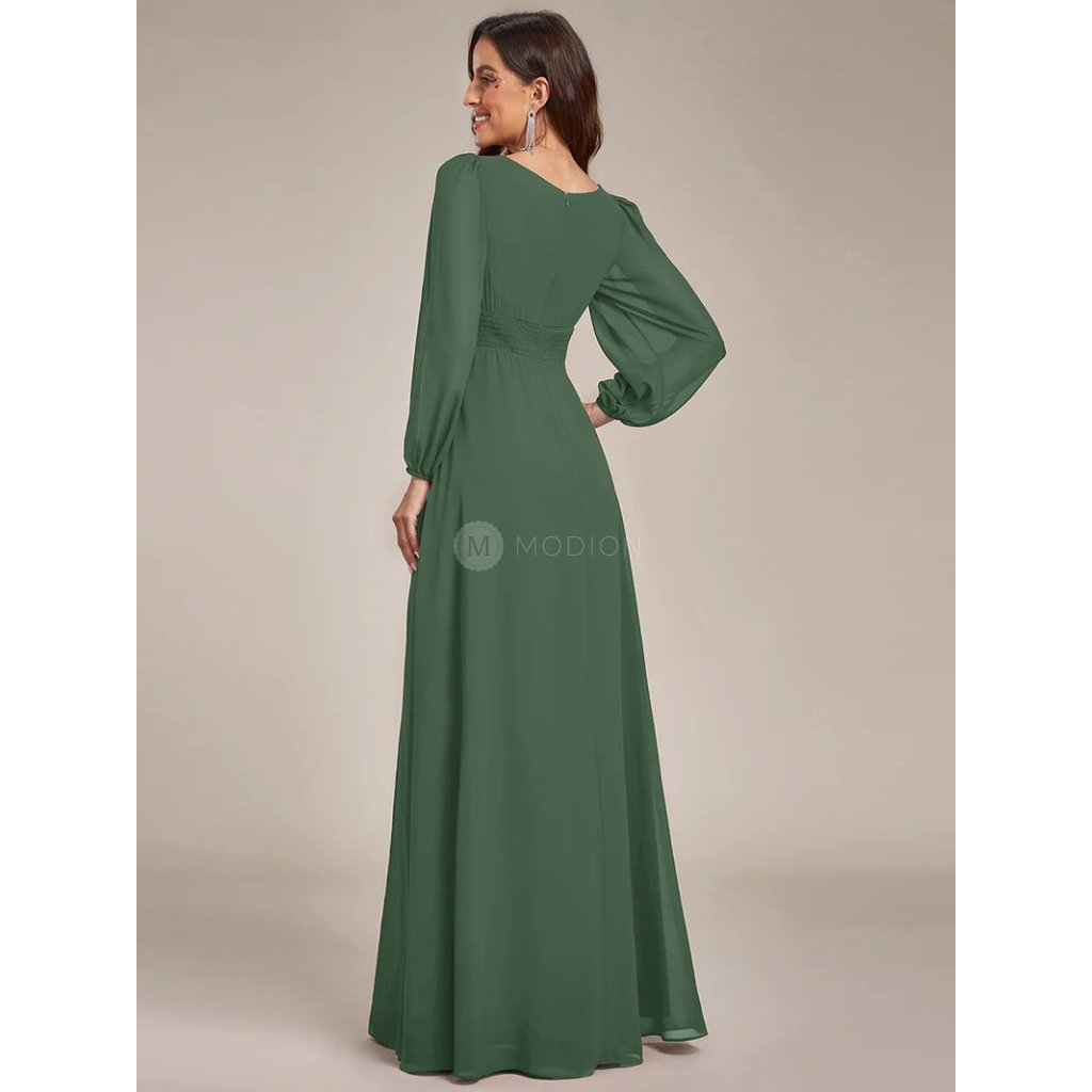 Společenské šaty Leonessa: Zelené eukalyptové dlouhé šifonové šaty s rukávy a poddajným pasem na svatbu i ples.