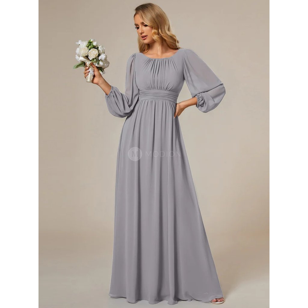 Společenské šaty Leonessa: Šedé dlouhé šifonové šaty s rukávy a poddajným pasem, elegantní na svatbu i ples.