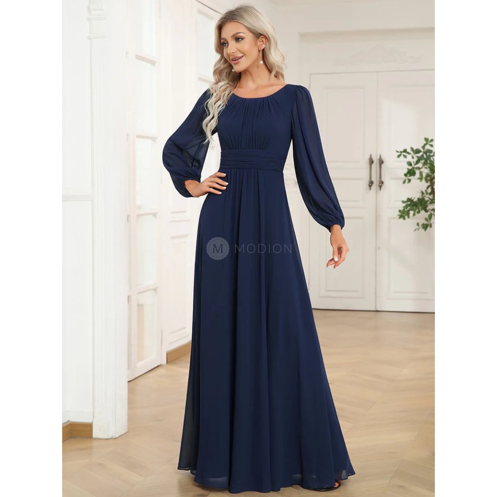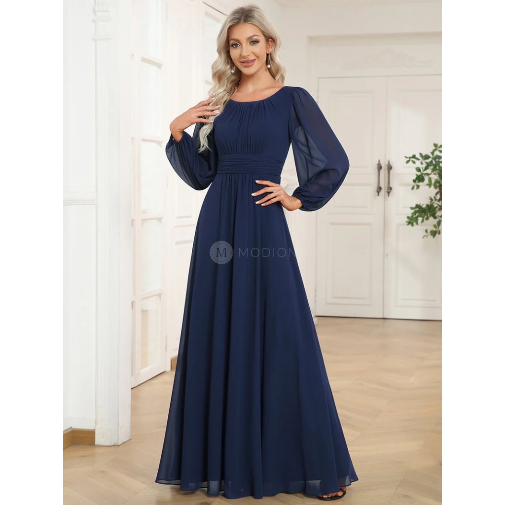 Společenské šaty Leonessa: Tmavě modré dlouhé šifonové šaty s rukávy a poddajným pasem, elegantní na ples i večer.