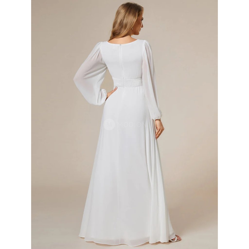 Společenské šaty Leonessa: Bílé dlouhé šifonové šaty s rukávy, lehké a vzdušné na svatbu, ples i slavnostní večer.