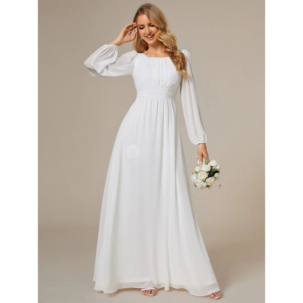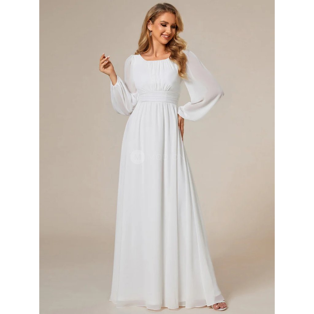 Lehký splývavý šifon dodává šatům vzdušnost a ladný pohyb při chůzi i tanci. Šaty mají elastický pas na zadním díle se žabičkováním, který zajišťuje pohodlí, přizpůsobení postavě a komfort při celodenním nošení. Dlouhé volné rukávy působí romanticky a jemně, zatímco řasený pas krásně zvýrazňuje siluetu a opticky prodlužuje postavu. Kulatý výstřih dodává modelu decentní, vyvážený a slavnostní vzhled. Celek působí nadčasově, žensky a velmi vkusně.