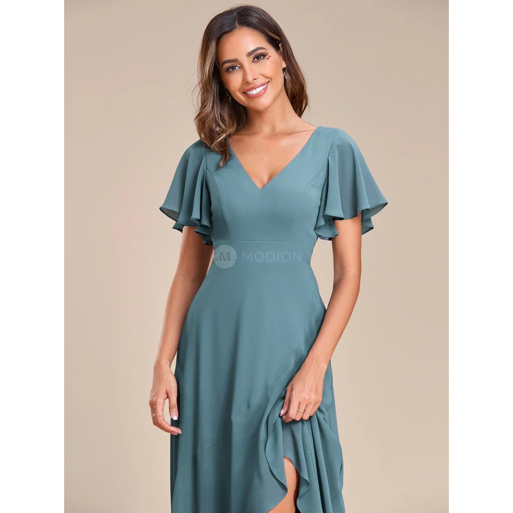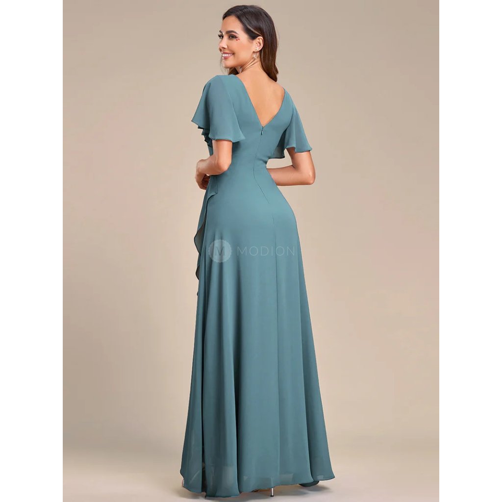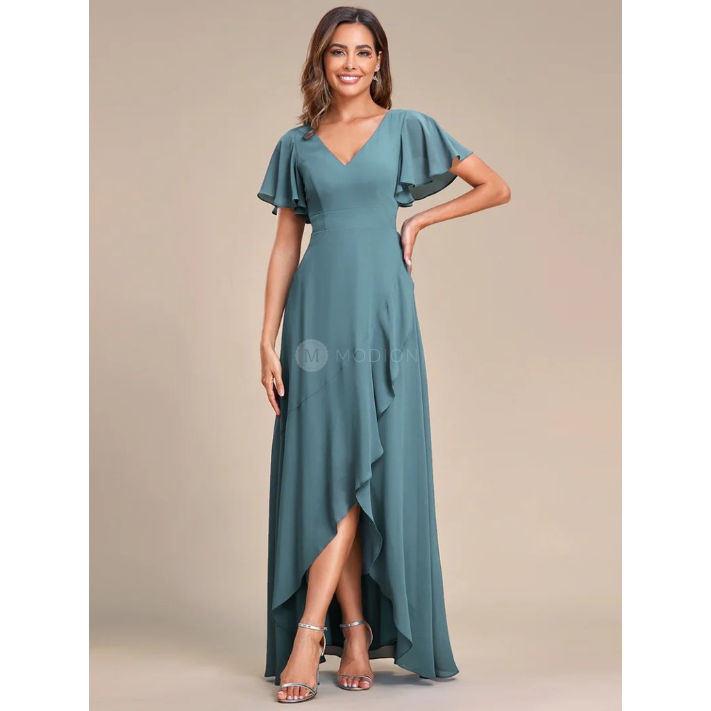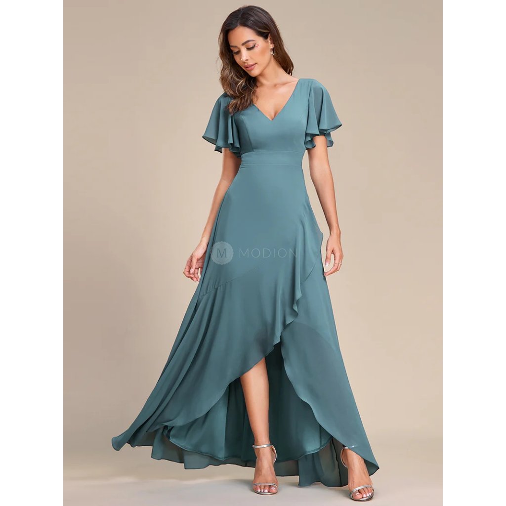 Dlouhé společenské šaty v okouzlujícím modrozeleném odstínu působí svěže, elegantně a zároveň velmi půvabně. Lehký šifon se při pohybu jemně vlní a dodává šatům vzdušnost i romantický nádech. Asymetrická sukně s volánkovým lemem vytváří ladnou siluetu a opticky prodlužuje postavu, zatímco krátké volánkové rukávy decentně zakrývají ramena a dodávají šatům něžný půvab.
