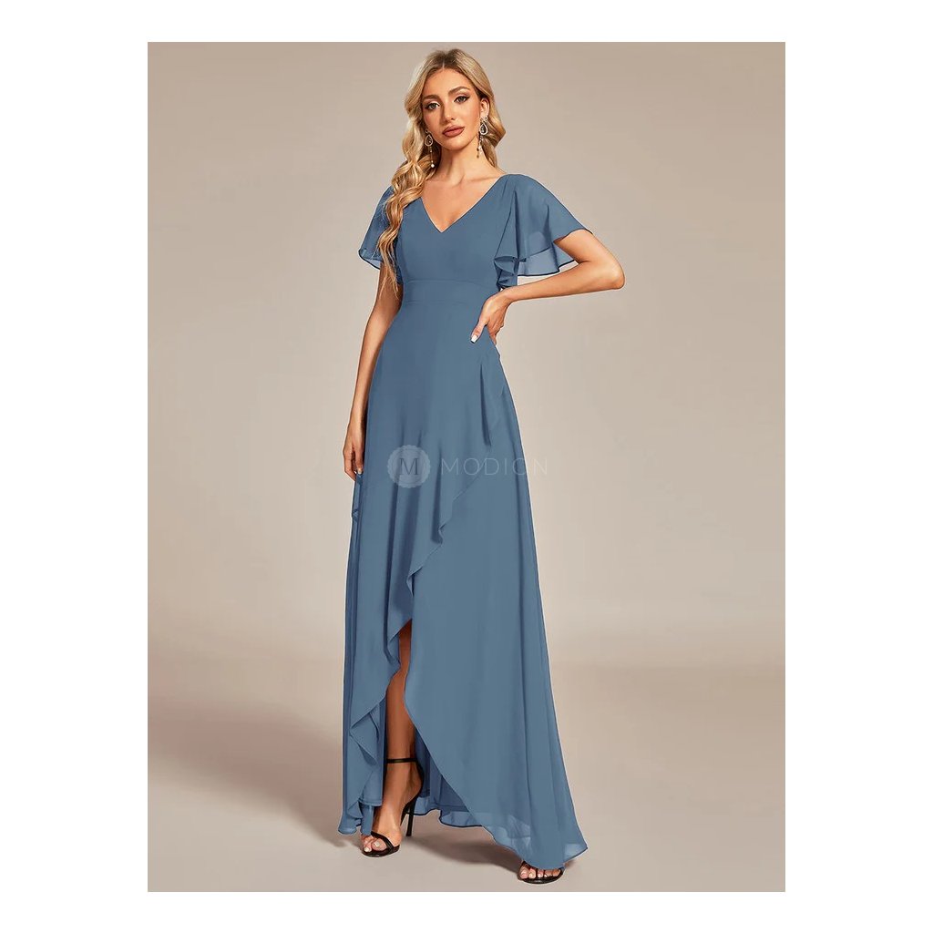 Elegantní dlouhé společenské šaty v jemném modrošedém odstínu působí klidně, sofistikovaně a přitom velmi žensky. Jsou ušité z kvalitního lehkého šifonu, který při pohybu krásně splývá a vytváří lehký vlnivý efekt. Asymetrická sukně s volánovým lemem působí vzdušně a opticky prodlužuje postavu. Krátké volánkové rukávy působí romanticky a zakryjí ramena.