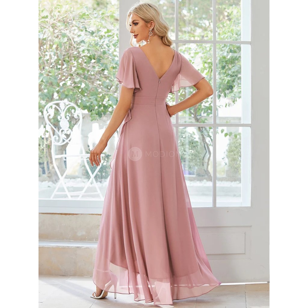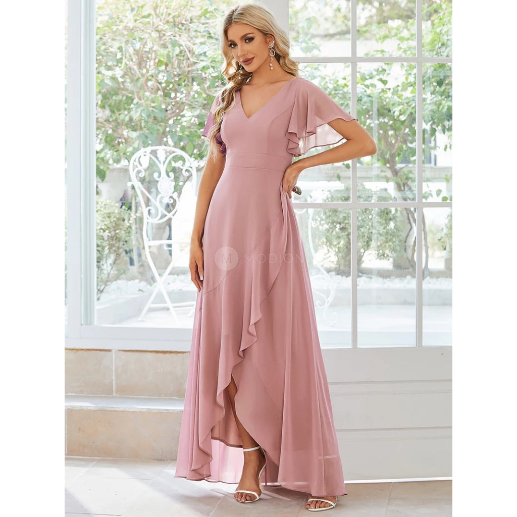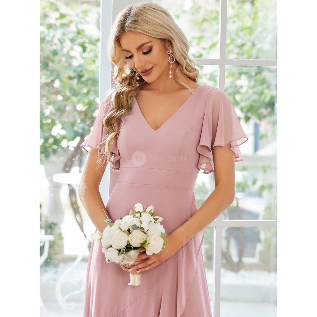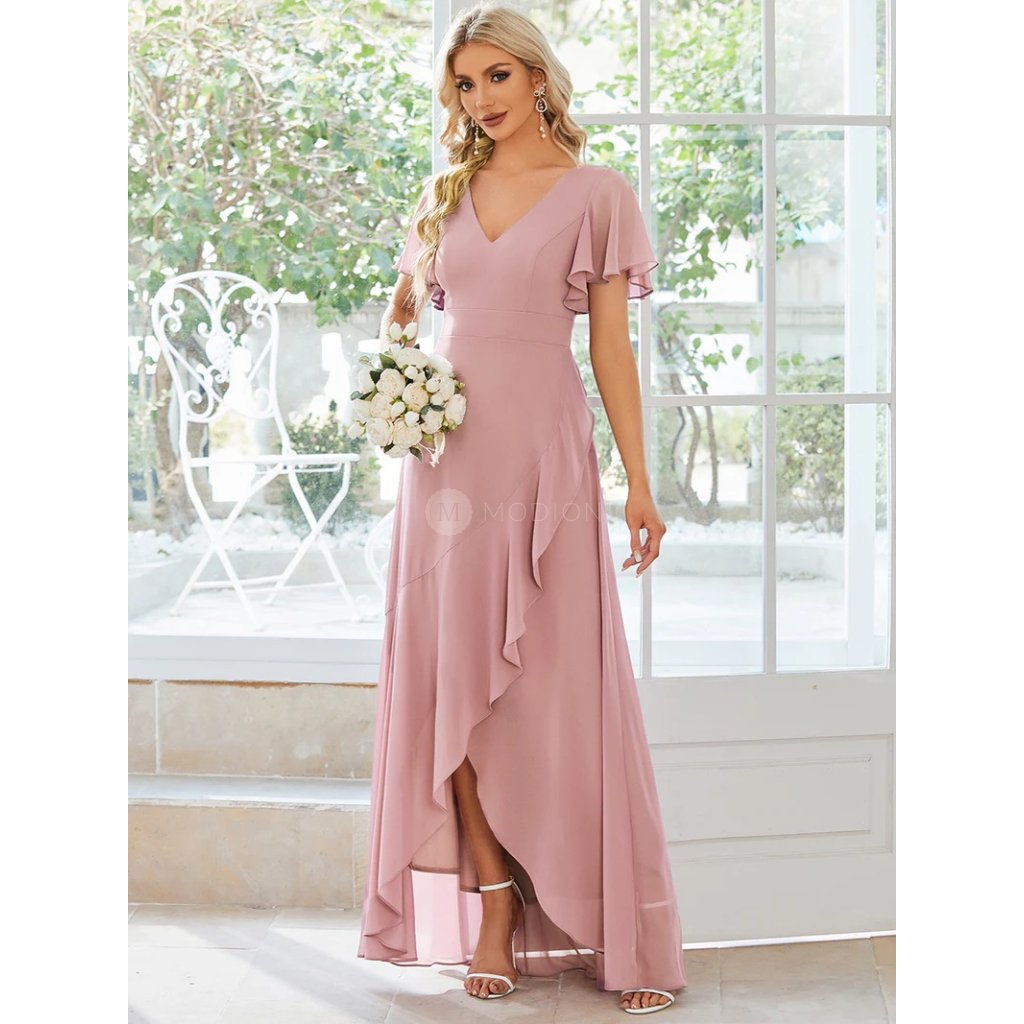 Lehký šifon zajišťuje vzdušnost a krásně splývavý vzhled při pohybu. Véčkový výstřih lichotí dekoltu a opticky prodlužuje siluetu. Krátké volánkové rukávy působí romanticky a jemně, zatímco asymetrická sukně s volány vytváří ladný pohyb a dodává šatům originální, slavnostní nádech. Střih přirozeně zvýrazňuje siluetu a působí velmi žensky.