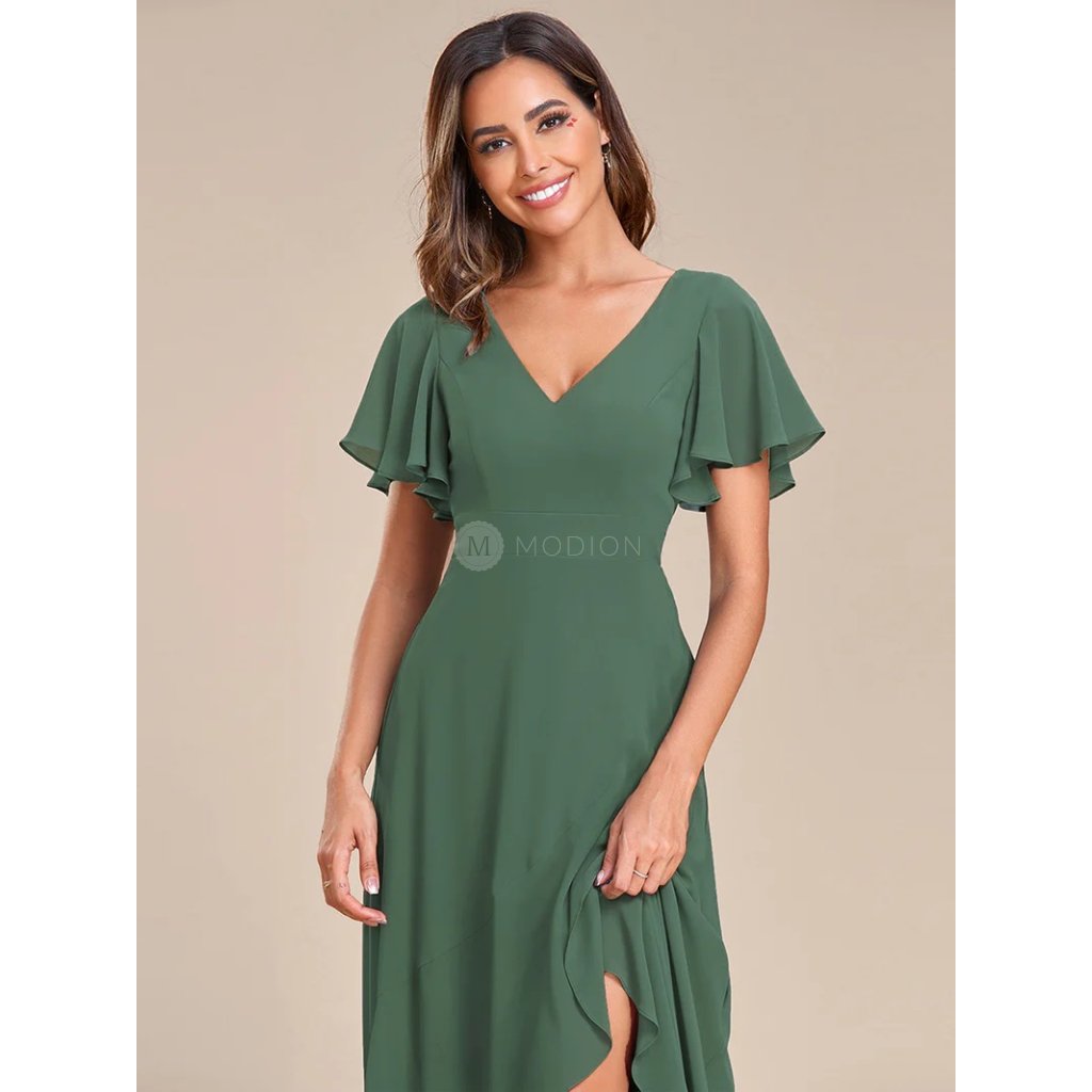 Zelené společenské šaty v midi délce v eukalyptově zeleném odstínu působí svěže, elegantně a velmi vkusně. Tlumený zelený tón dodává modelu lehkost a přirozený slavnostní výraz, vhodný pro denní i večerní společenské události.