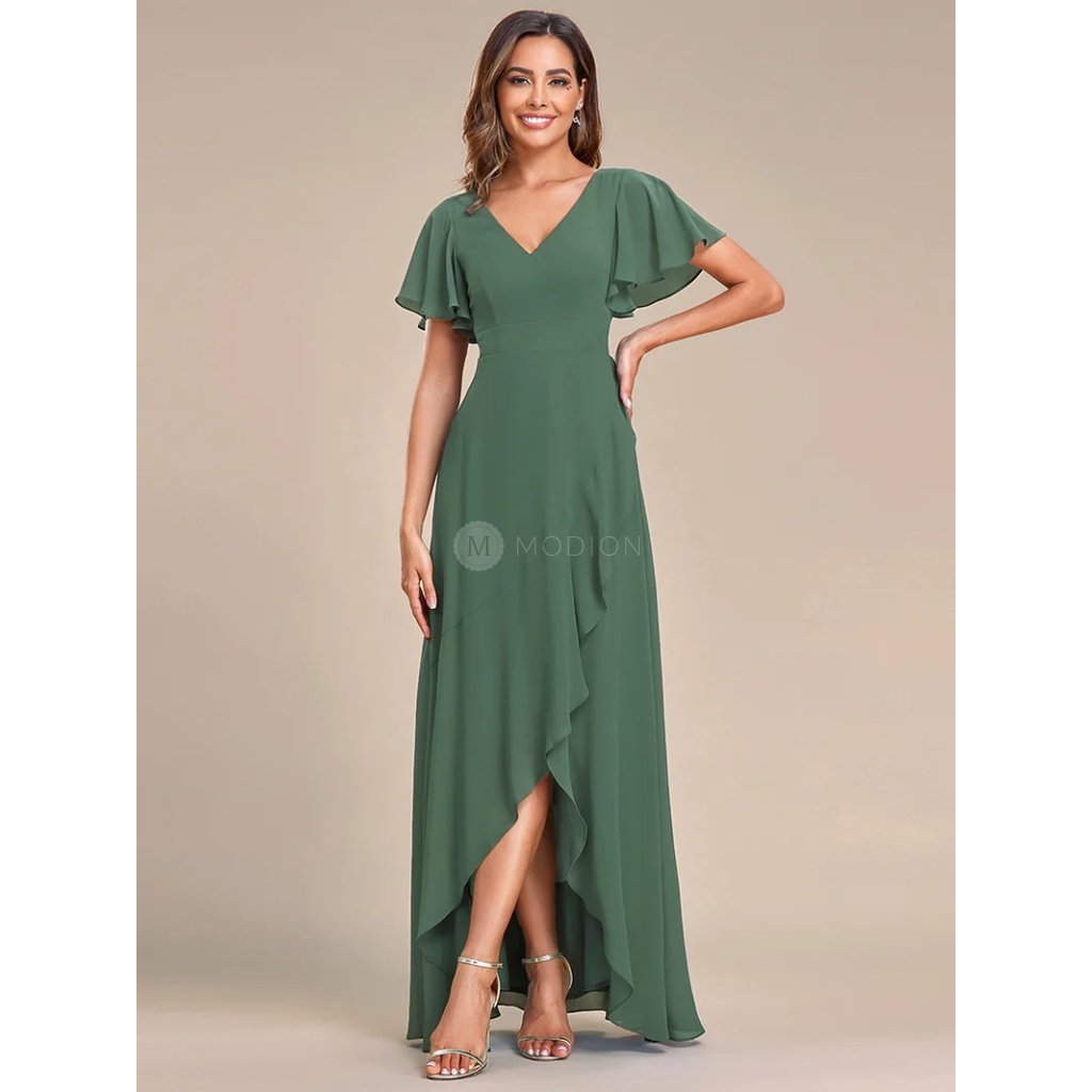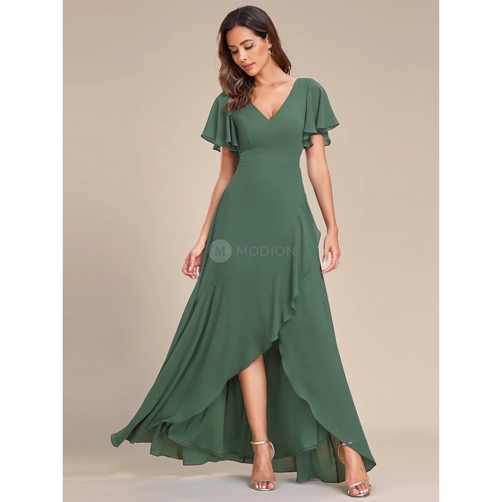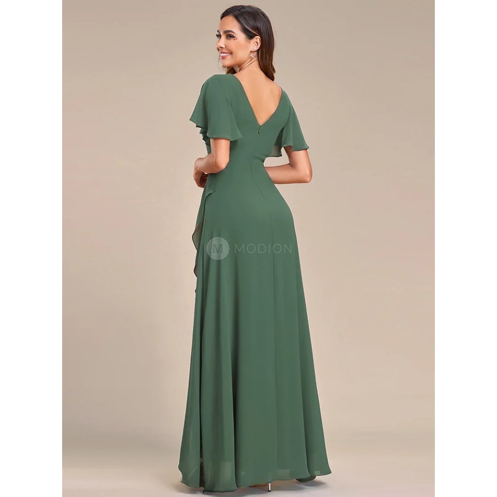 Lehký šifonový materiál dodává šatům vzdušnost a jemný pohyb při chůzi i tanci. Véčkový výstřih lichotí dekoltu a opticky prodlužuje siluetu, krátké volánkové rukávy působí žensky a něžně. Asymetricky řešená sukně přináší lehkou dynamiku a moderní eleganci, celek působí harmonicky, vyváženě a velmi nadčasově.