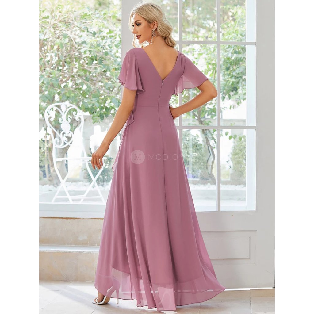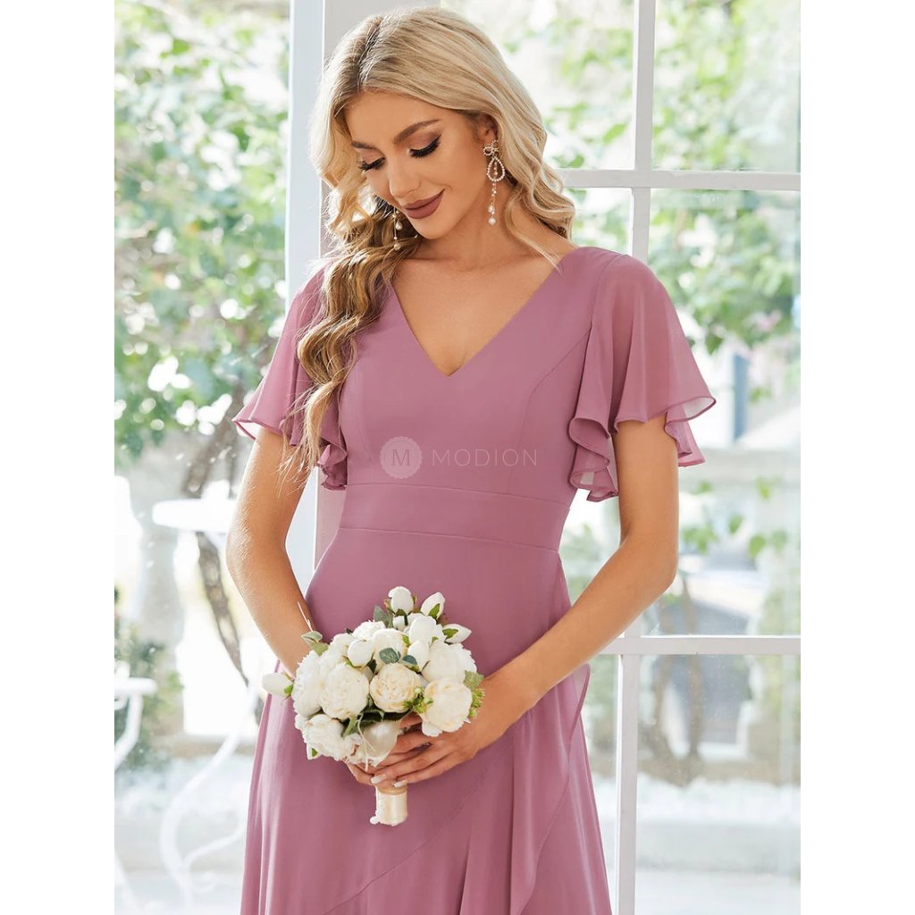Dlouhé společenské šaty ve starorůžové barvě působí jemně, romanticky a elegantně. Lehký šifon se při chůzi nádherně vlní a dodává šatům vzdušnost i lehkost. Asymetrická sukně s volánkovým lemem opticky prodlužuje postavu a vytváří ladný, splývavý efekt. Krátké volánkové rukávy dodávají šatům něžný vzhled a decentně zakrývají ramena.