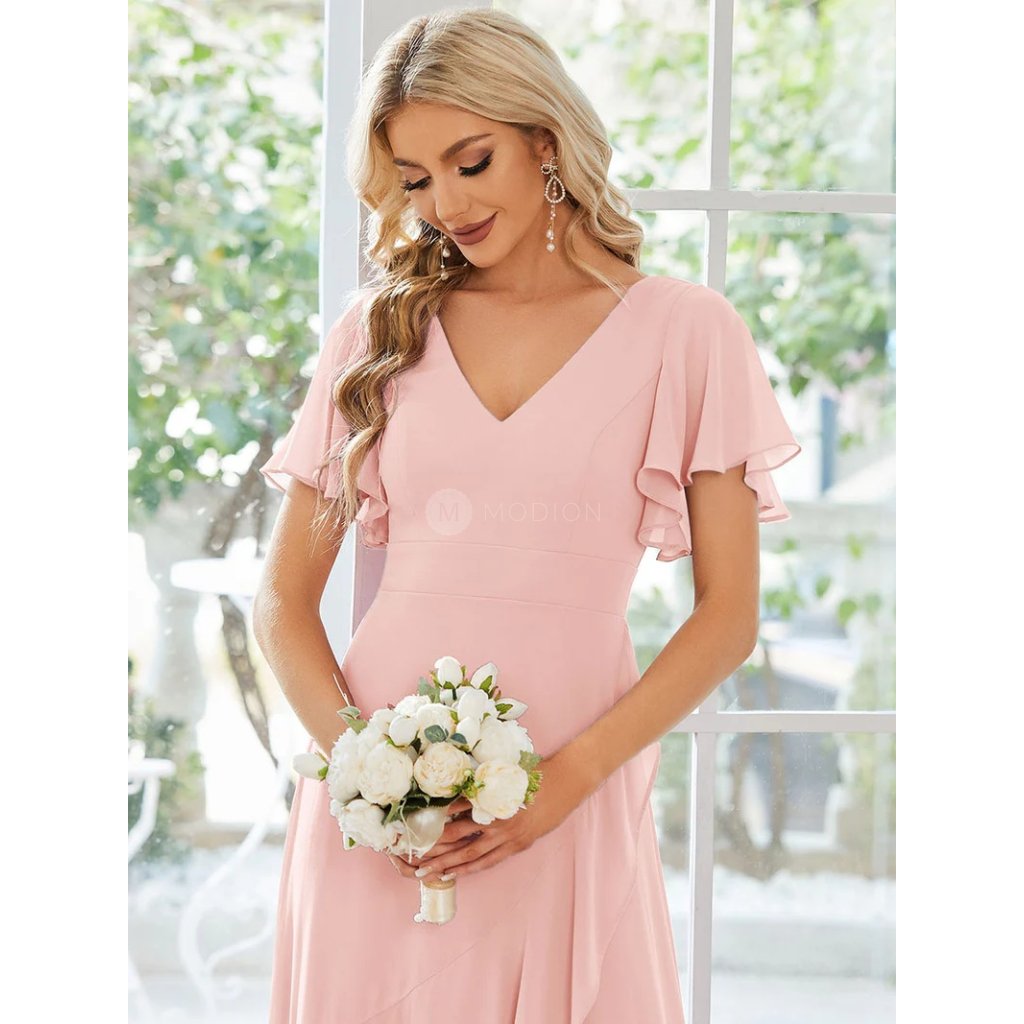 Midi růžové společenské šaty v šifonovém provedení s volány v jemném růžovém odstínu působí romanticky, elegantně a velmi žensky. Světlý růžový tón dodává modelu lehkost a nadčasový slavnostní charakter vhodný pro denní i večerní společenské události.