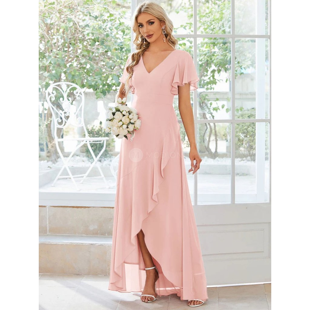 Lehký šifon zajišťuje vzdušnost a krásně splývavý vzhled při pohybu. Véčkový výstřih lichotí dekoltu a opticky prodlužuje siluetu. Krátké volánkové rukávy působí jemně a romanticky, zatímco asymetrická sukně s volány vytváří ladný pohyb a dodává šatům originální, slavnostní nádech. Střih přirozeně zvýrazňuje siluetu a působí velmi žensky.