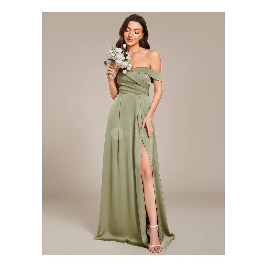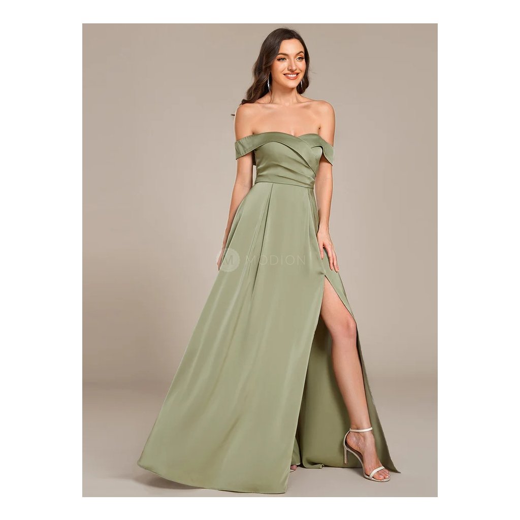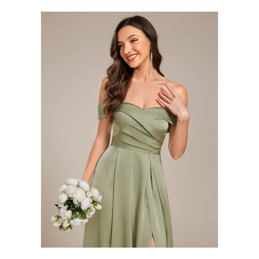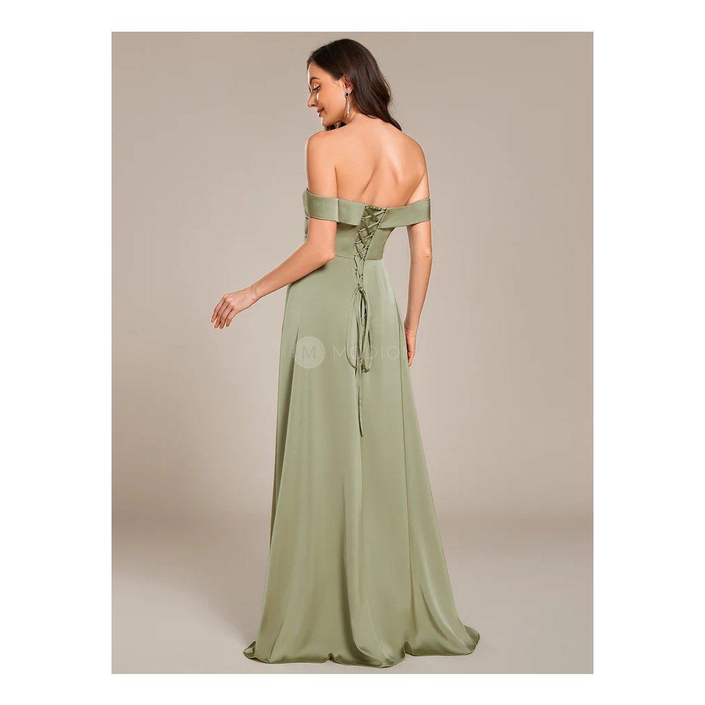 Saténové šaty se šněrováním na zádech a spadenými ramínky, s elegantním rozparkem. Korzetový živůtek s pevnou výstuží krásně tvaruje poprsí. Perfektní volba na svatbu, ples i večerní slavnosti.