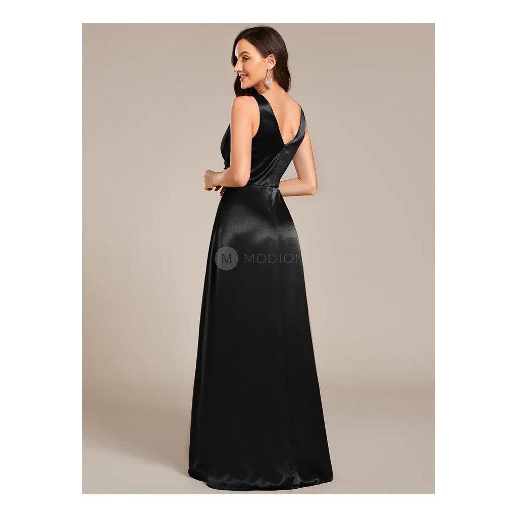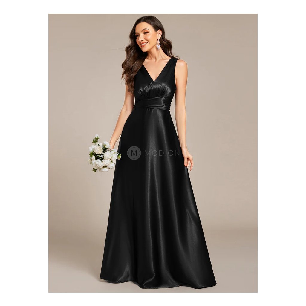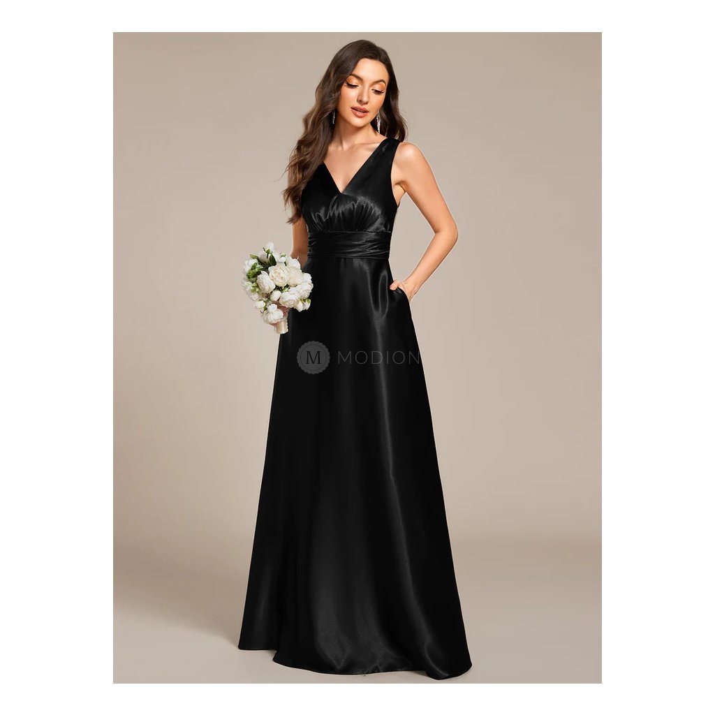 Dlouhé černé společenské šaty ze saténu s kapsami působí elegantně, nadčasově a velmi vkusně. Jsou ideální volbou pro ženy, které hledají kombinaci luxusního vzhledu, pohodlí a praktických detailů.