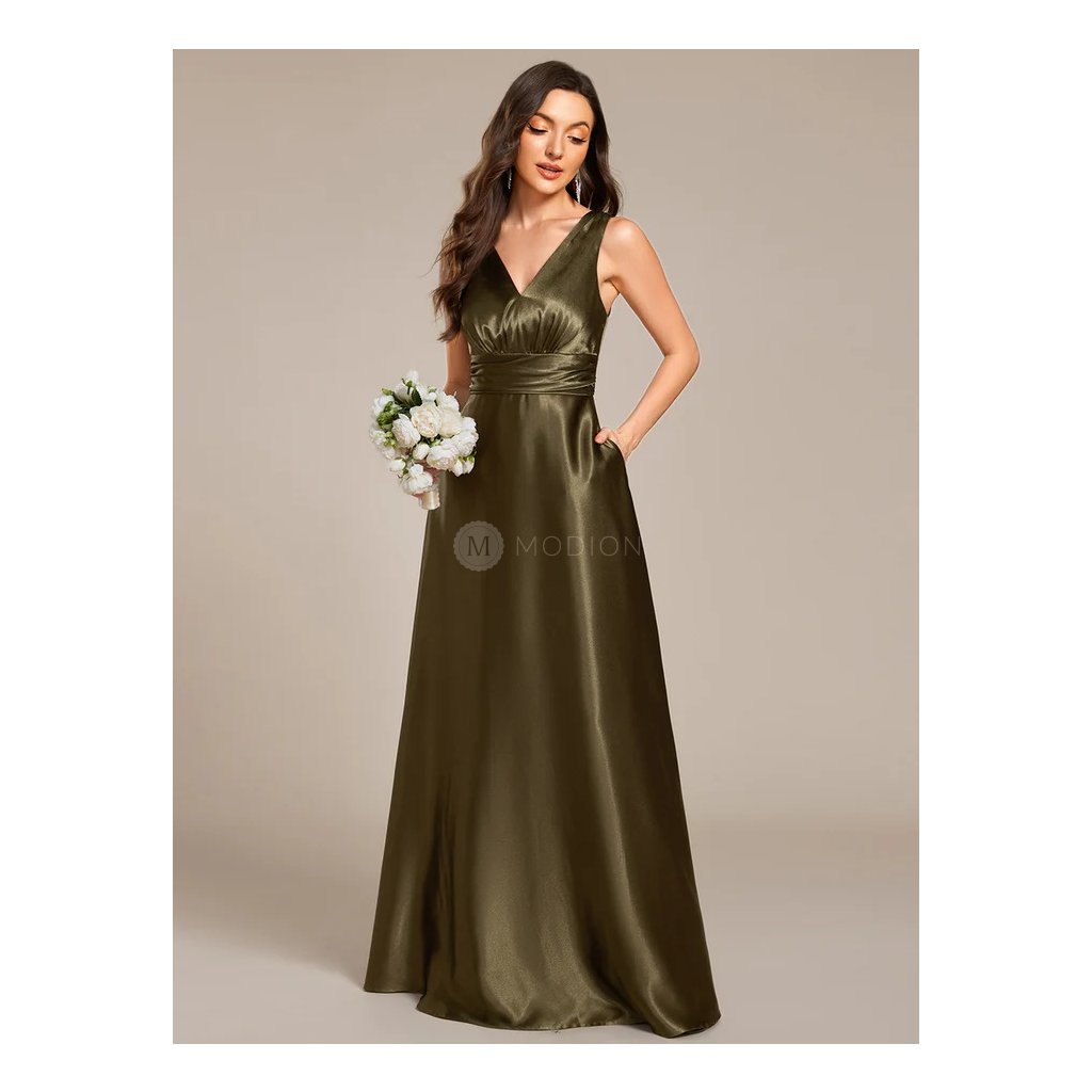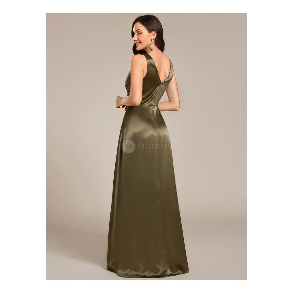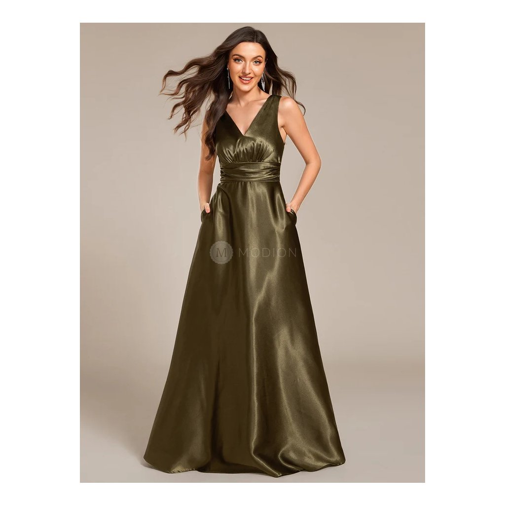 Zelené olivové společenské šaty z lesklého saténu působí moderně a neotřele. Áčkový střih lichotí postavě, výstřih do V zdůrazňuje dekolt a praktické kapsy přidávají šatům na pohodlí. Splývavá sukně v dlouhé délce se při chůzi ladně pohybuje a podtrhuje jedinečný vzhled.