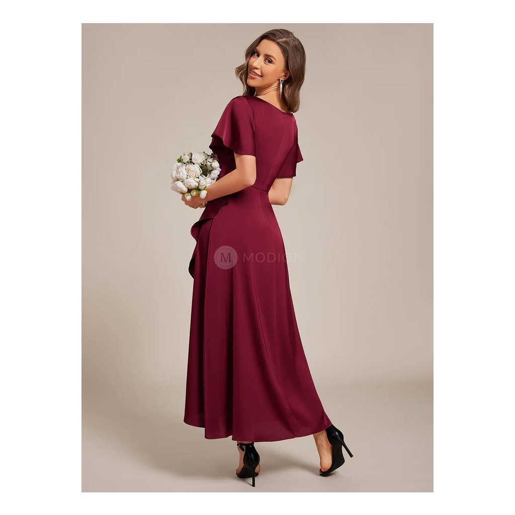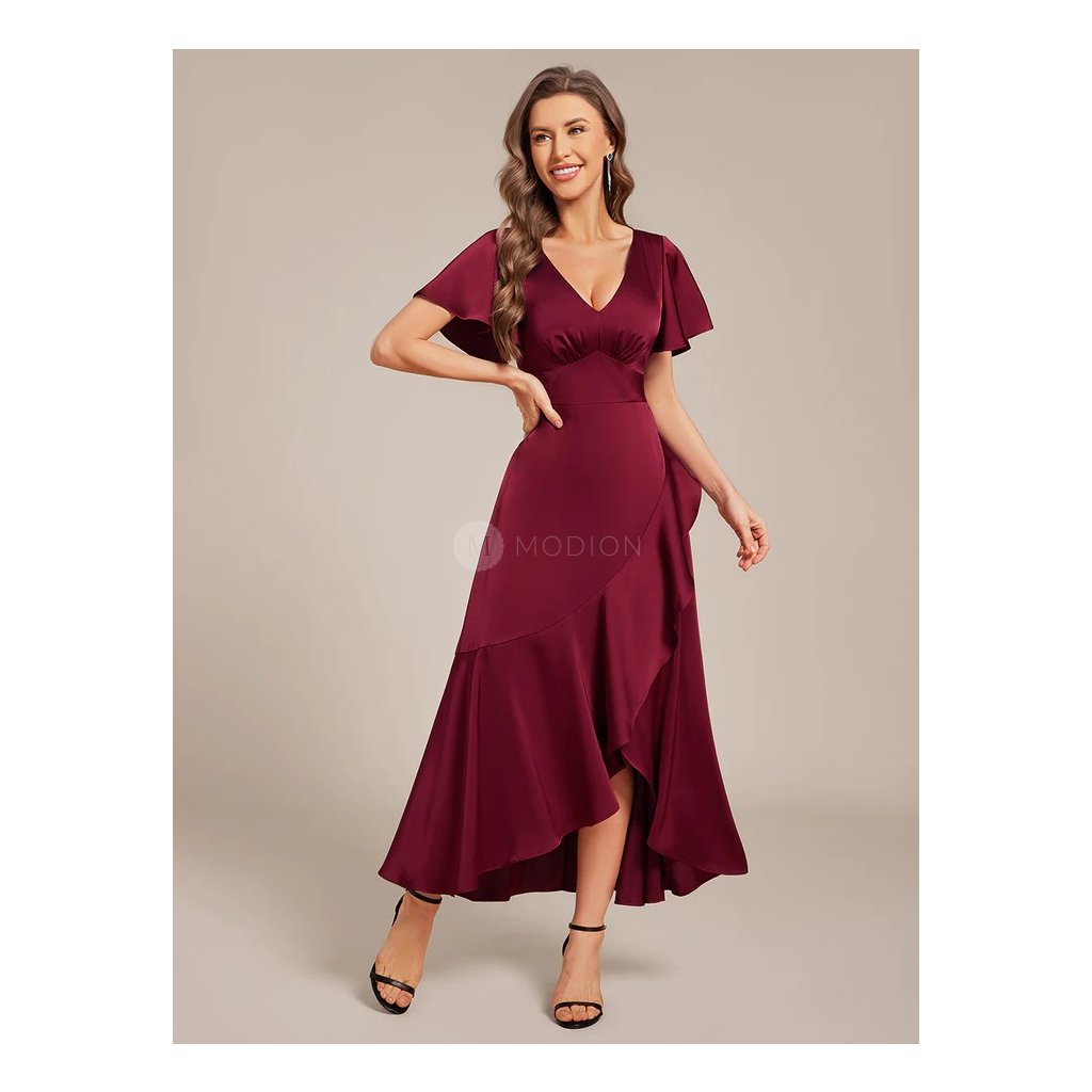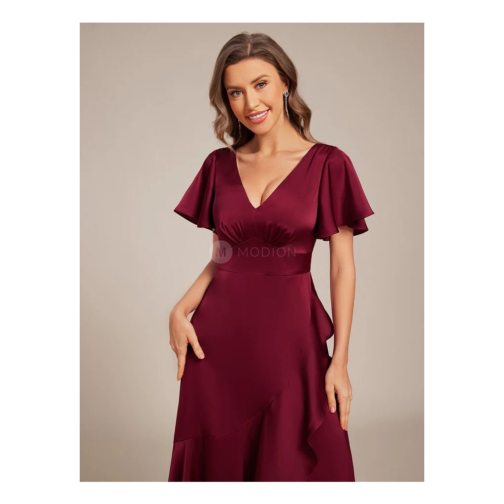 Vínové saténové šaty s asymetrickou midi délkou a výrazným volánem přes sukni. Elegantní krátký volánkový rukáv podtrhuje šarm celého modelu – na svatbu, ples i večírek.