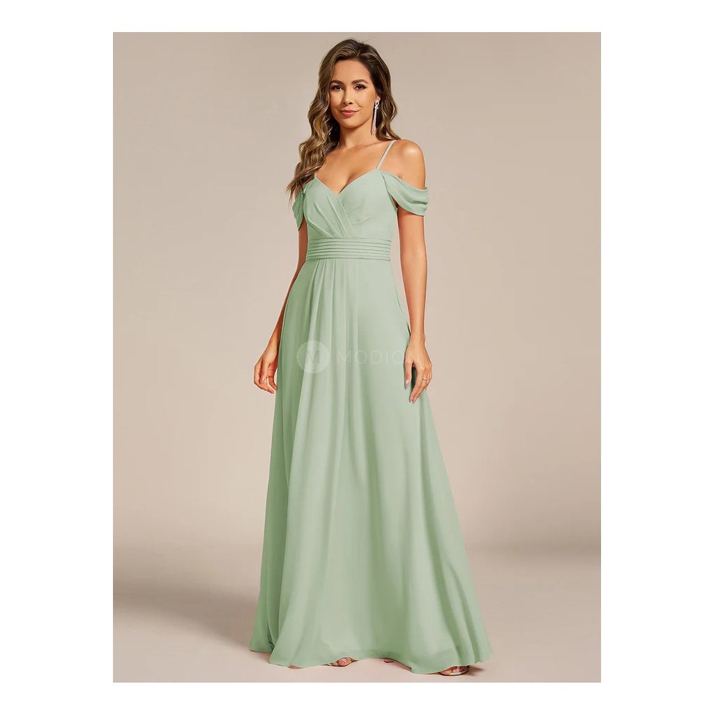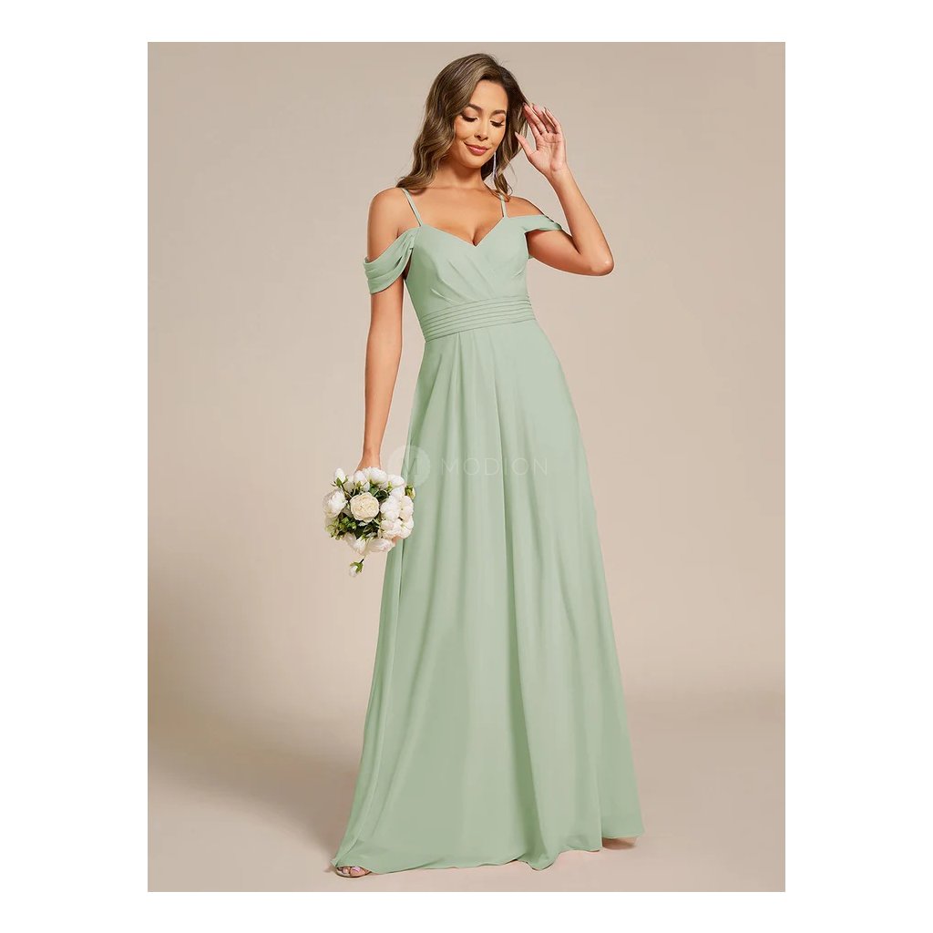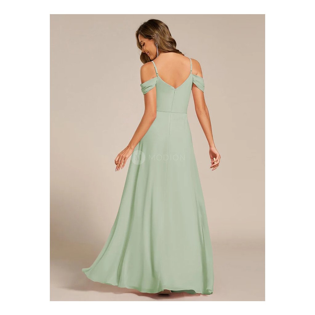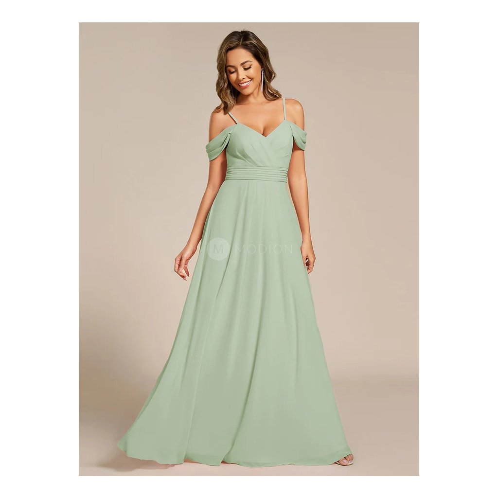 Jemné světle zelené šifonové šaty na ramínka s elegantními spadlými rukávy a plisovaným pasem. Ideální volba na svatbu, ples i slavnostní večery.