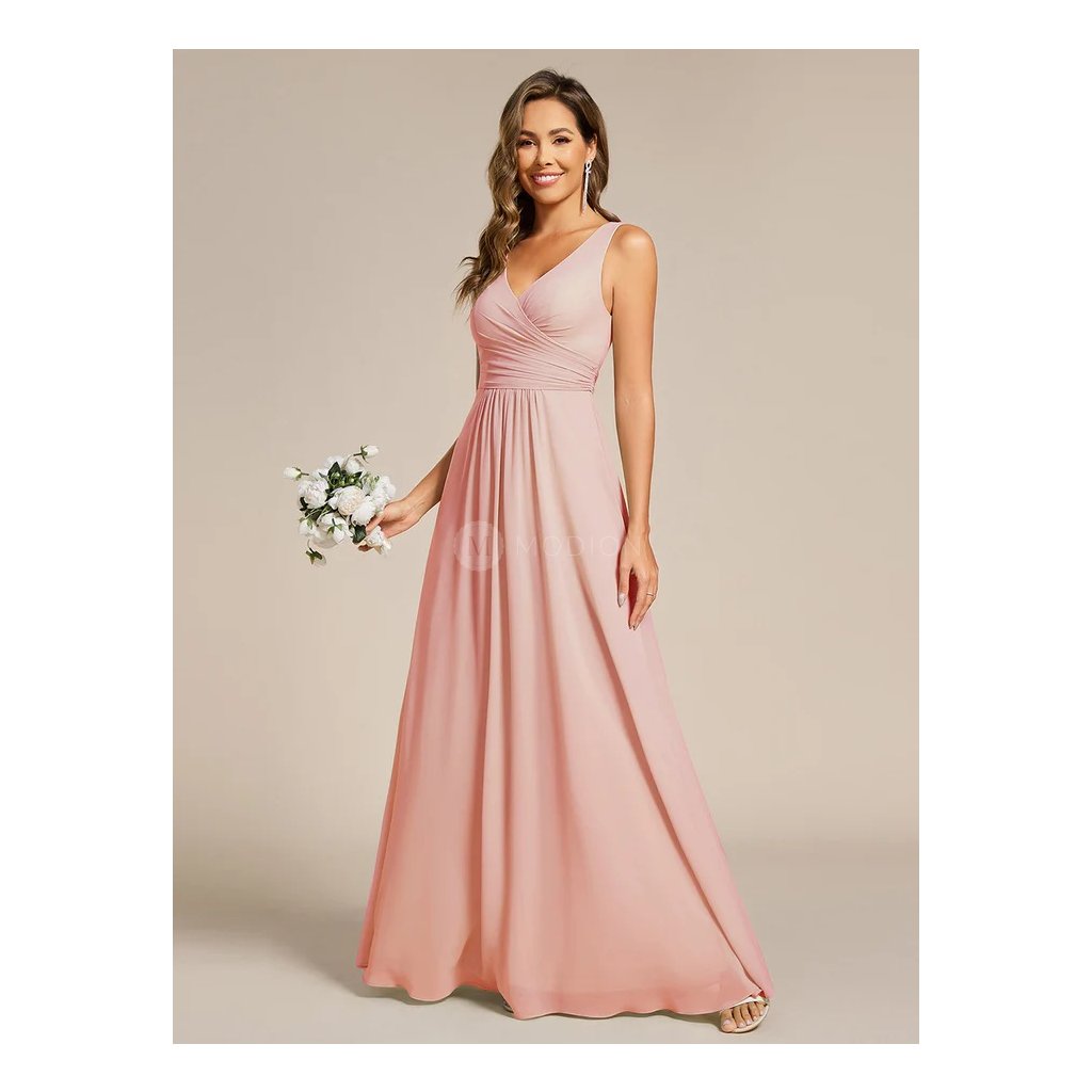 Dlouhé růžové společenské šaty v šifonovém provedení bez rukávů ve světle růžovém odstínu působí lehce, romanticky a velmi vkusně. Světlý růžový tón dodává modelu něžnost a jemně ženský výraz, který je ideální pro slavnostní a večerní příležitosti.