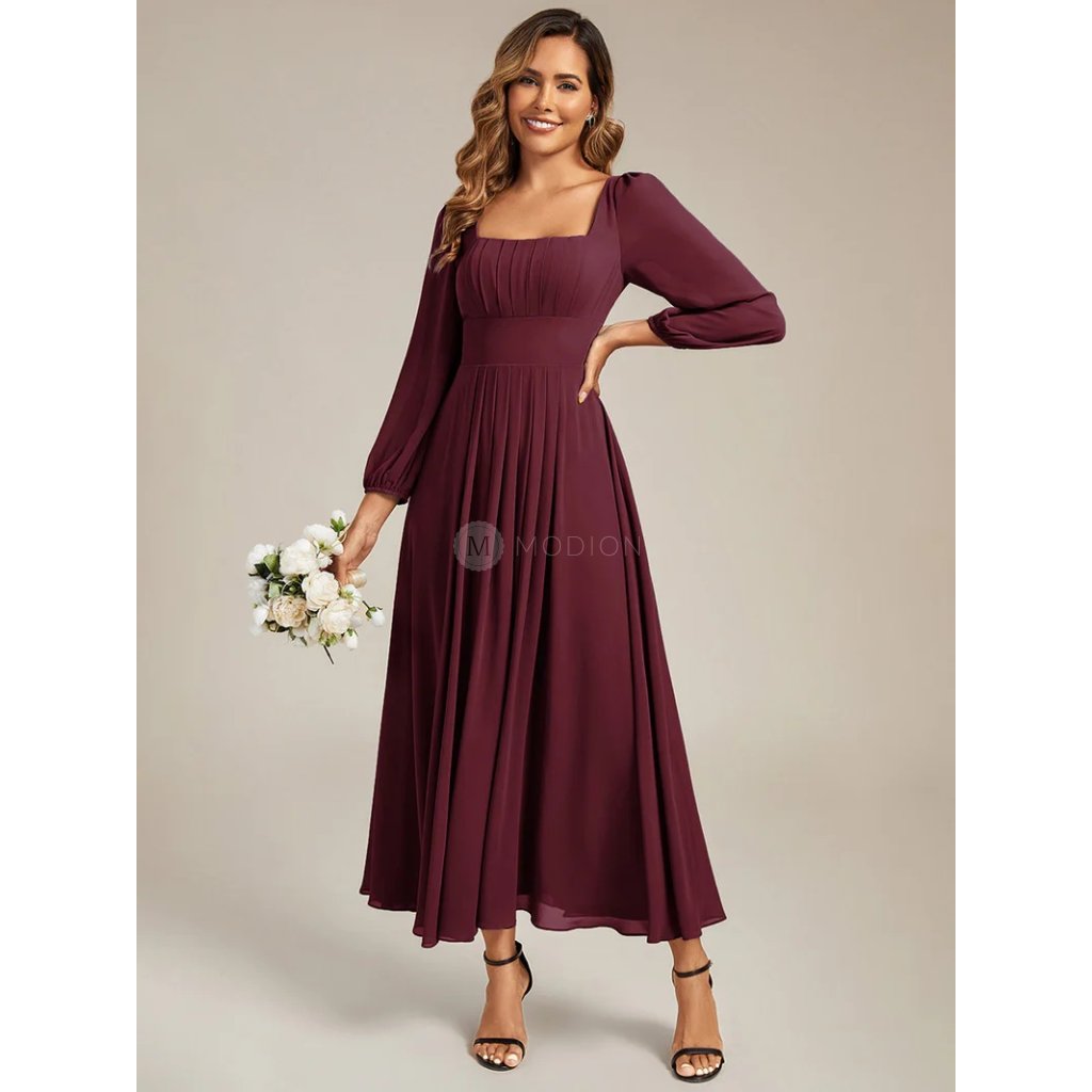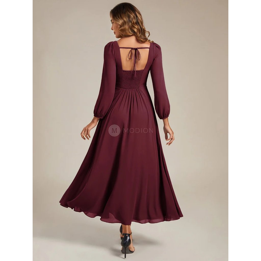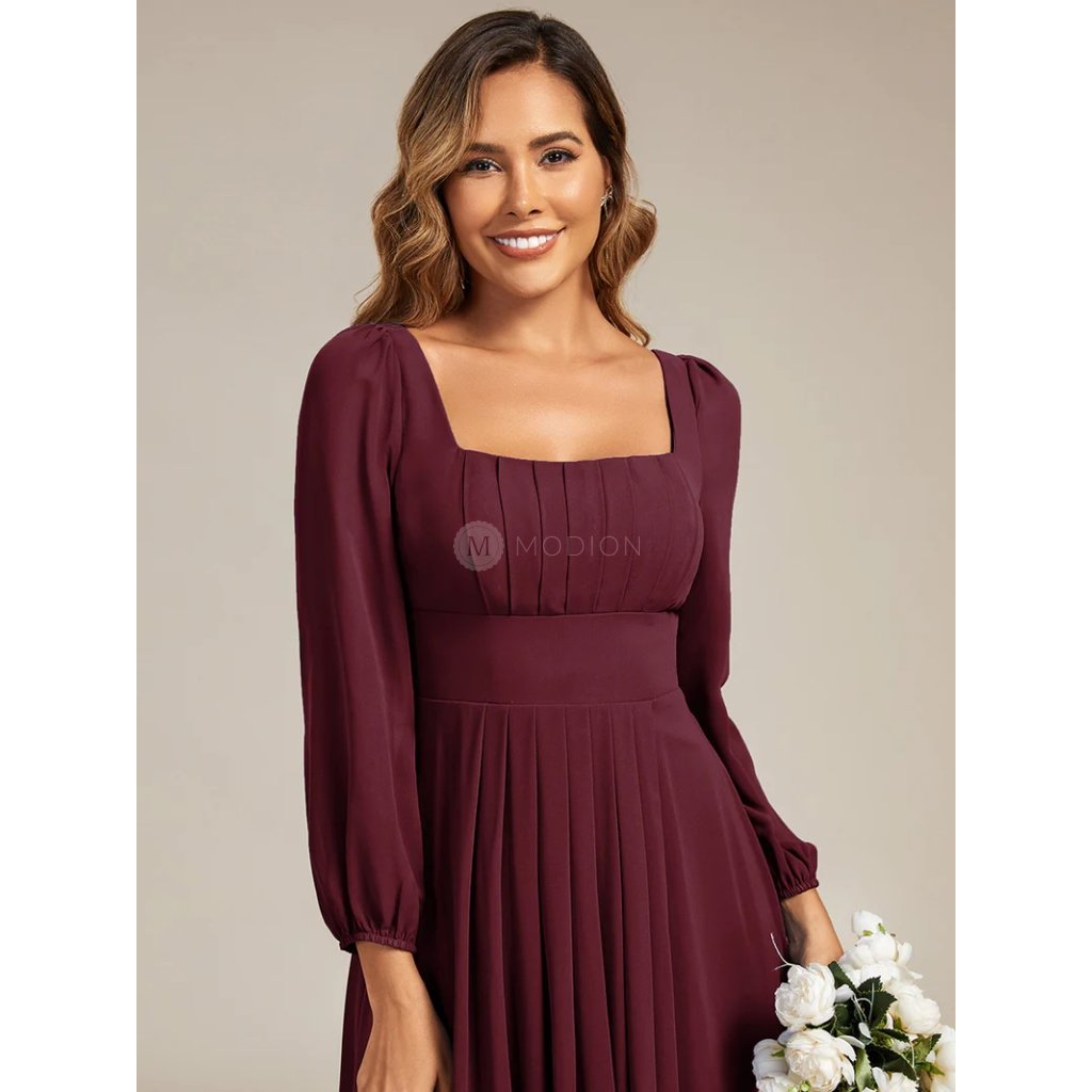 Červené vínové společenské šaty vynikají nadčasovým a moderním zpracováním, které krásně podtrhne ženskou siluetu při každé slavnostní příležitosti. Jsou ušité z lehkého a splývavého šifonu, který působí vzdušně a elegantně. Živůtek zdobí jemné plisé a čtvercový výstřih, jenž lichotivě zvýrazňuje dekolt i linii klíční kosti. Vyztužené košíčky poskytují potřebnou oporu a pohodlí během nošení. V pase šaty elegantně tvarují postavu, zatímco áčková sukně se sklady ladně splývá a působivě se vlní při pohybu. Zadní díl je řešen praktickým žabičkováním, které se přizpůsobí postavě, a romantickým vázáním nad odhalenými zády, což dodává šatům jemný a ženský prvek.