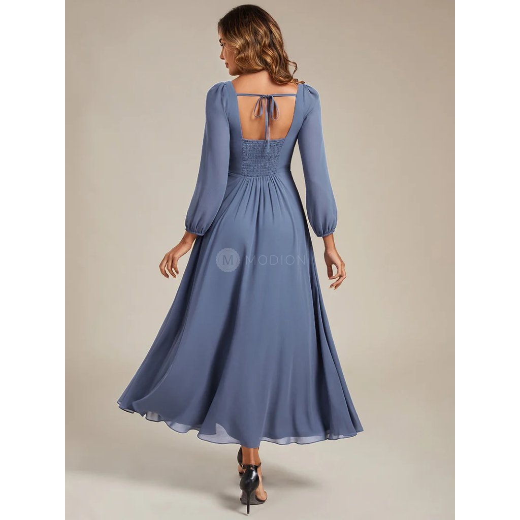 Dlouhé modrošedé společenské šaty působí jemně, elegantně a velmi harmonicky. Jsou ideální volbou pro ženy, které hledají reprezentativní slavnostní model s dlouhým rukávem, čistými liniemi a klidným, nadčasovým charakterem.