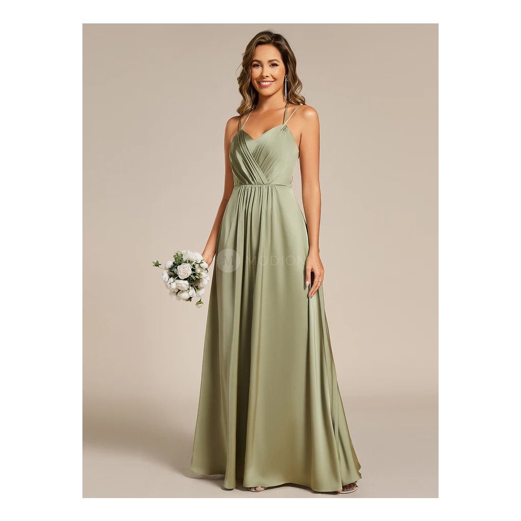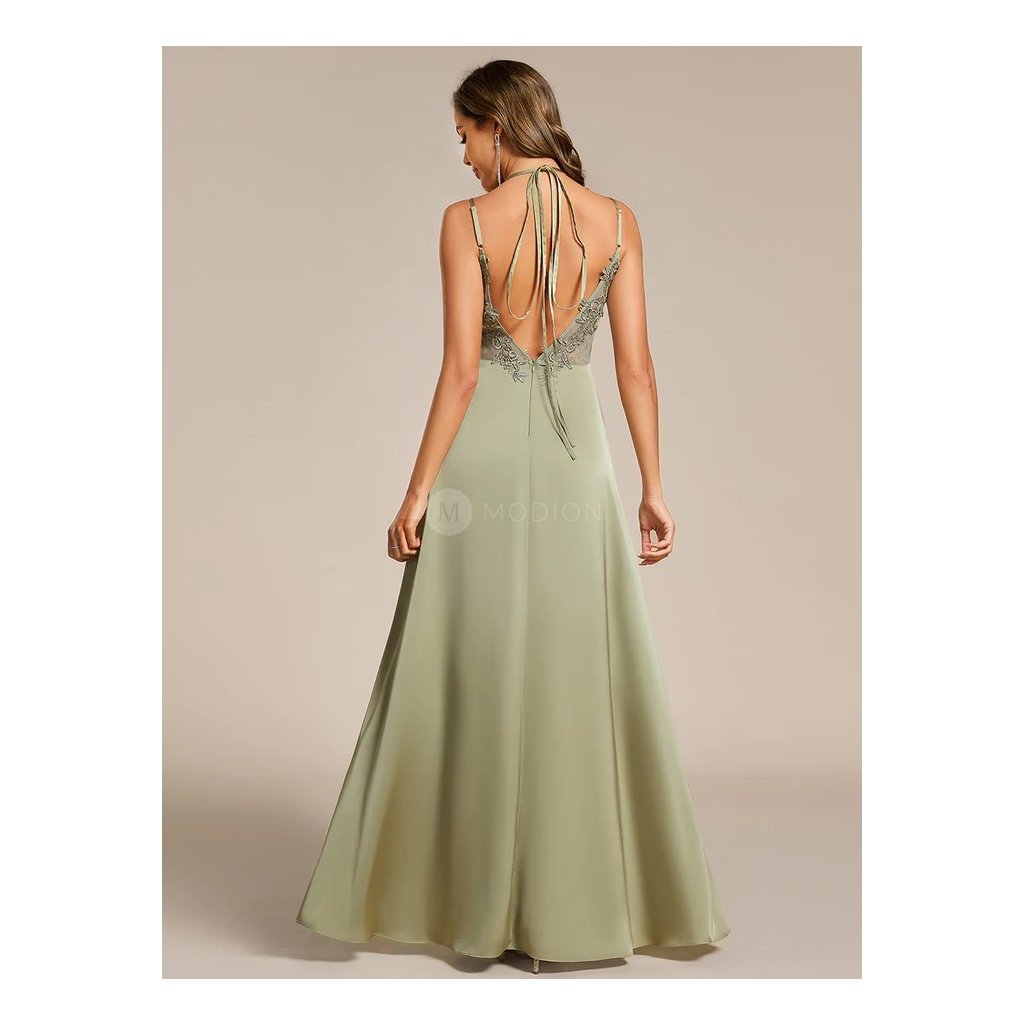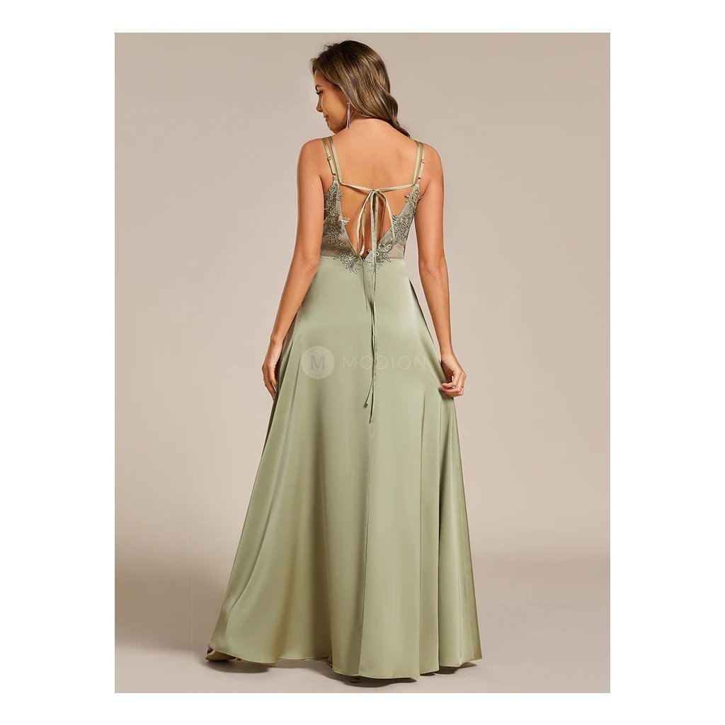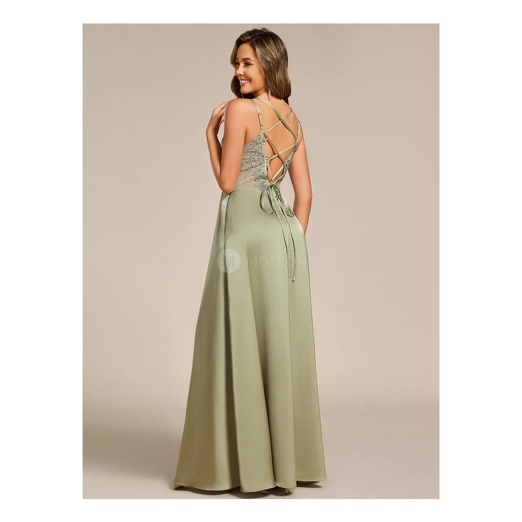 Dlouhé šedozelené saténové šaty s krajkovým zdobením na zádech a šněrováním. Elegantní áčkový střih lichotí postavě a hodí se na svatby i plesy.