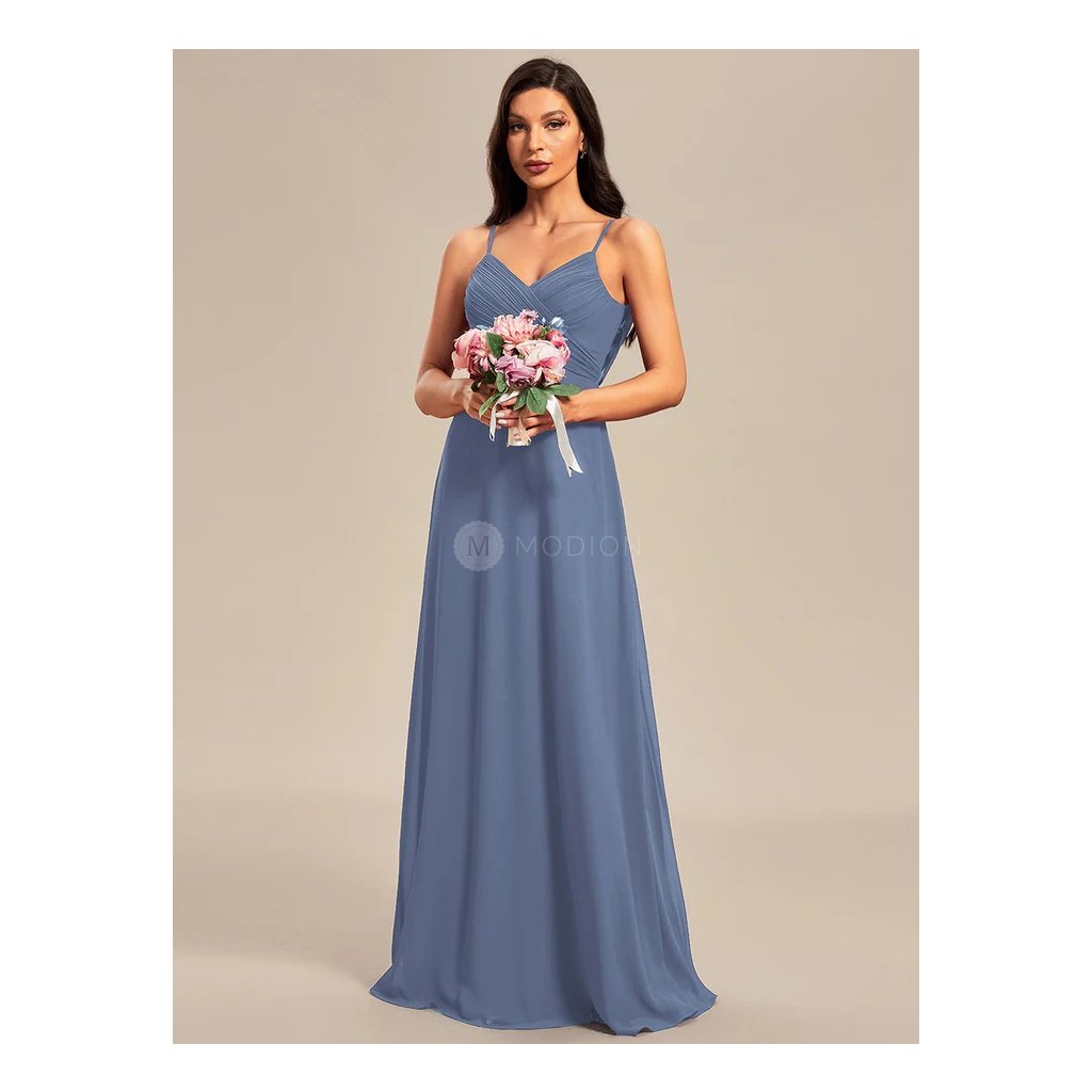 Společenské šaty Plumeria: Modrošedé šifonové šaty na ramínka s vodopádovými zády. Dlouhé šaty na svatbu i ples.