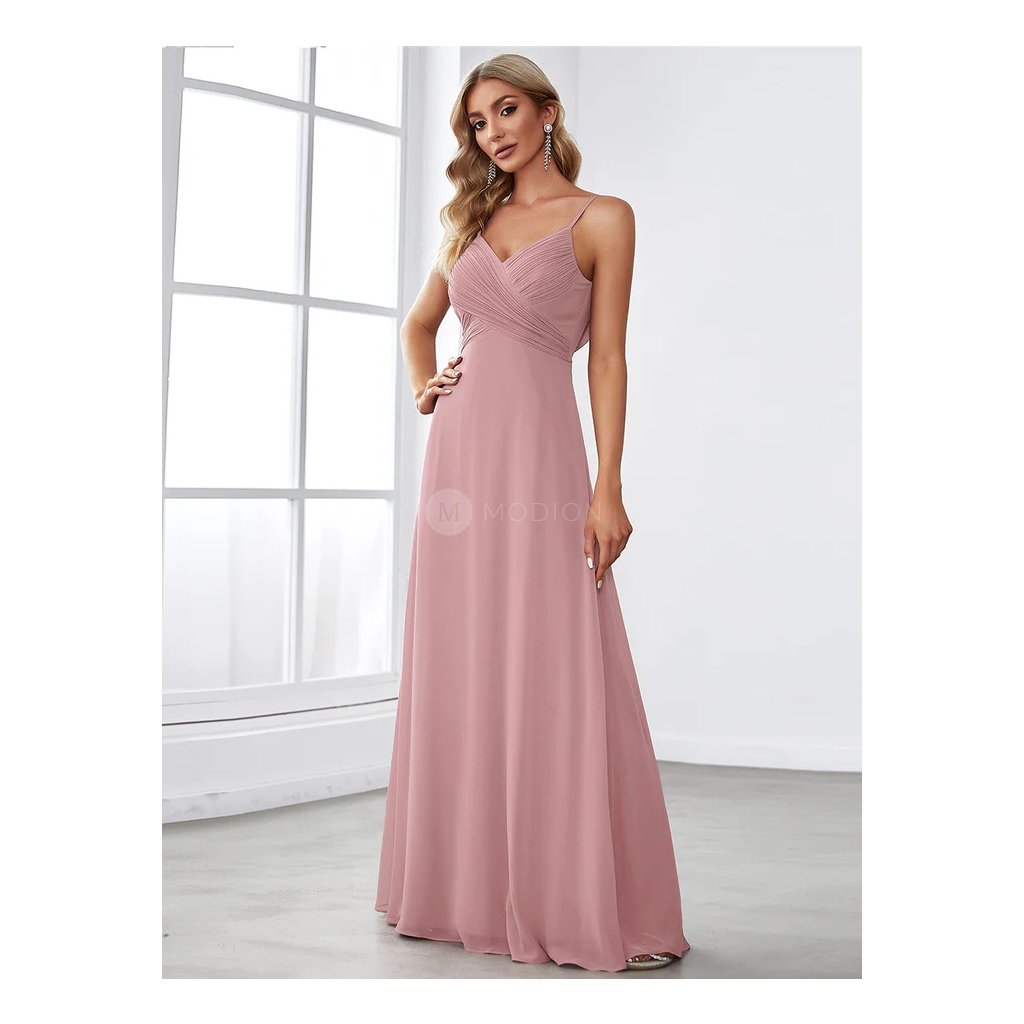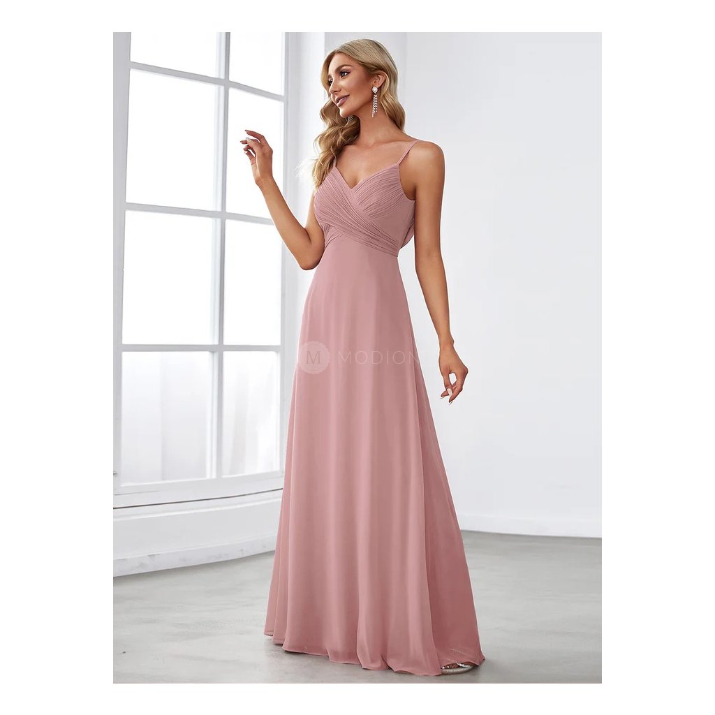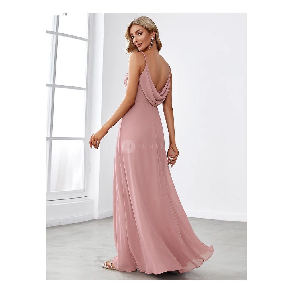 Dlouhé večerní šaty ve starorůžové barvě s tenkými ramínky, plisovaným živůtkem a elegantním výstřihem na zádech ve stylu „voda“. Vzdušný šifon a jemná barva tvoří něžný a sofistikovaný vzhled pro plesy a slavnostní události.
