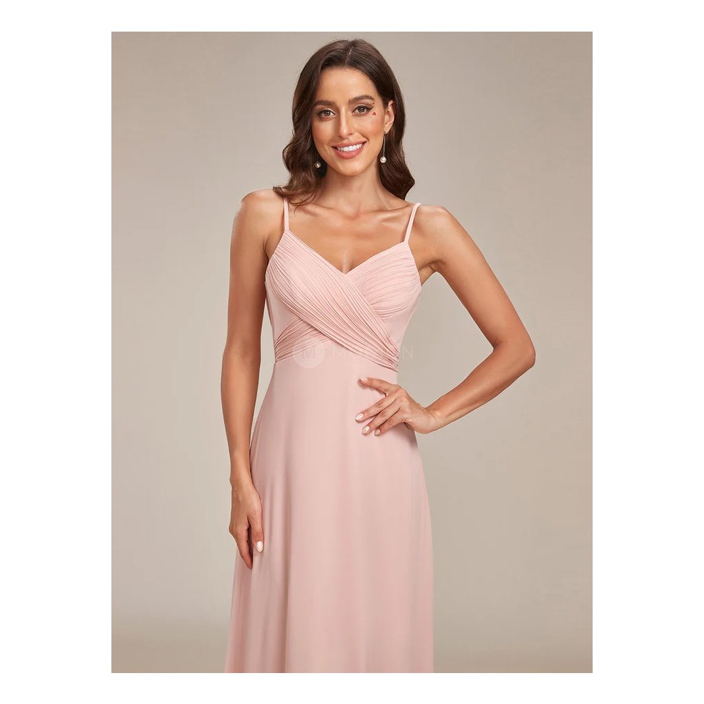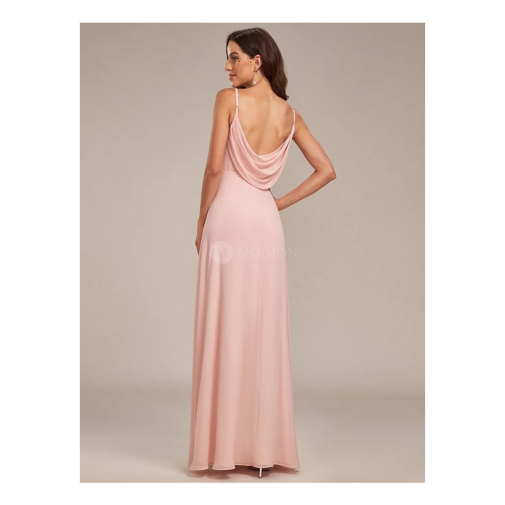 Elegantní růžové orchidej večerní šaty z lehkého šifonu s plisovaným živůtkem, tenkými ramínky a výrazným vodopádovým výstřihem na zádech „voda“. Skvělá volba na ples, svatbu i galavečer.