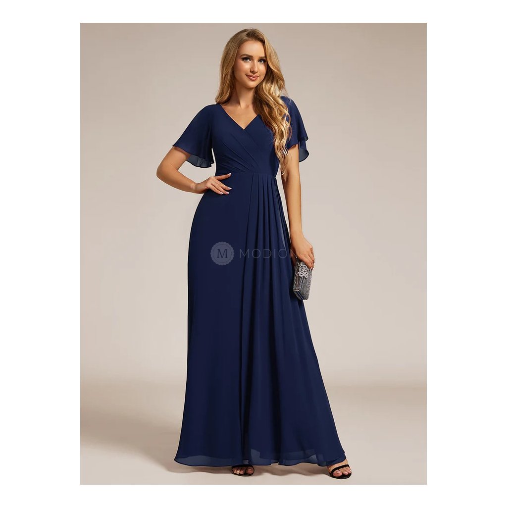 Tmavě modré společenské šaty z lehkého šifonu působí elegantně a nadčasově. Živůtek s jemným řasením plynule přechází do splývavé áčkové sukně se sklady, kterou oživuje rozparek pro volný a ladný pohyb. Výstřih do V opticky prodlužuje postavu, zatímco krátký elegantní rukáv zakrývá ramena a dodává šatům jemnou vzdušnost.