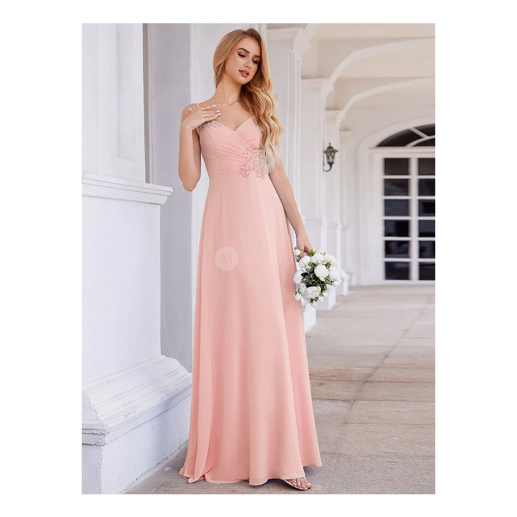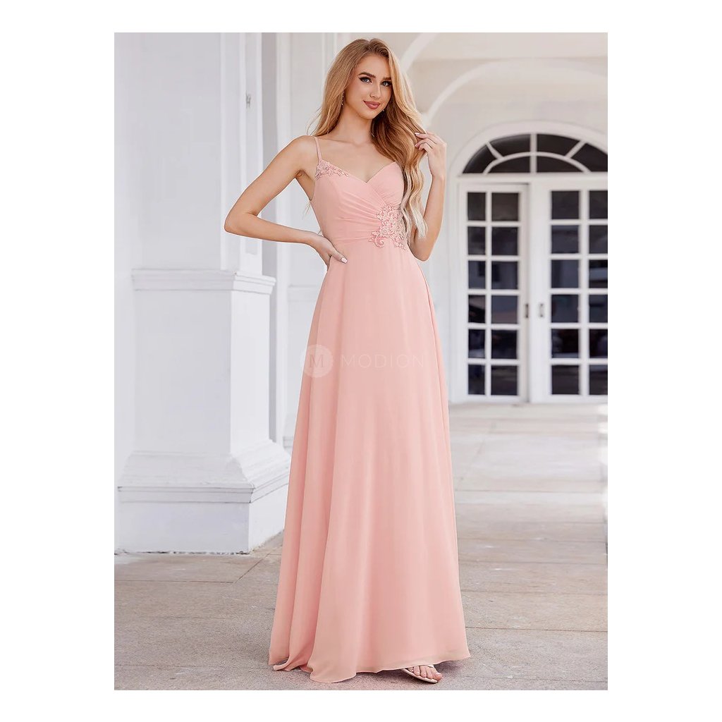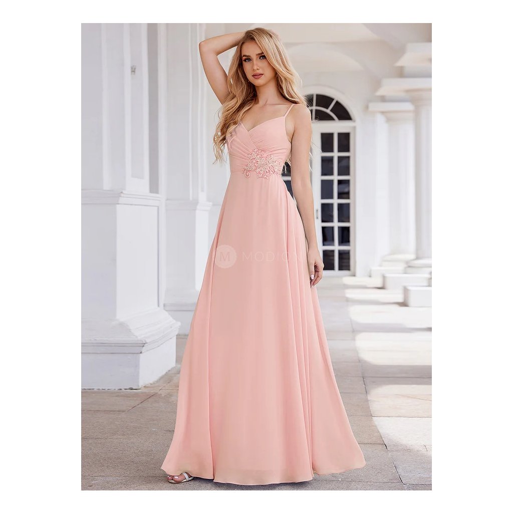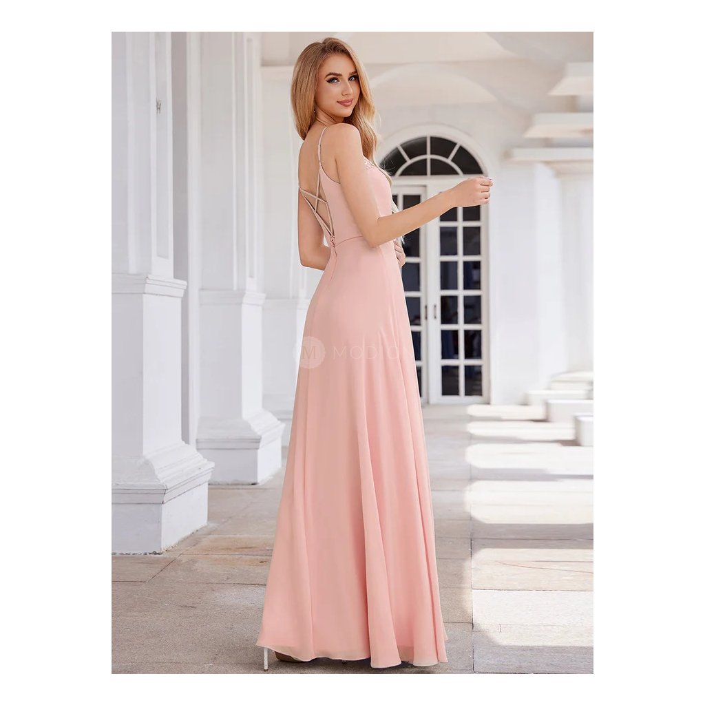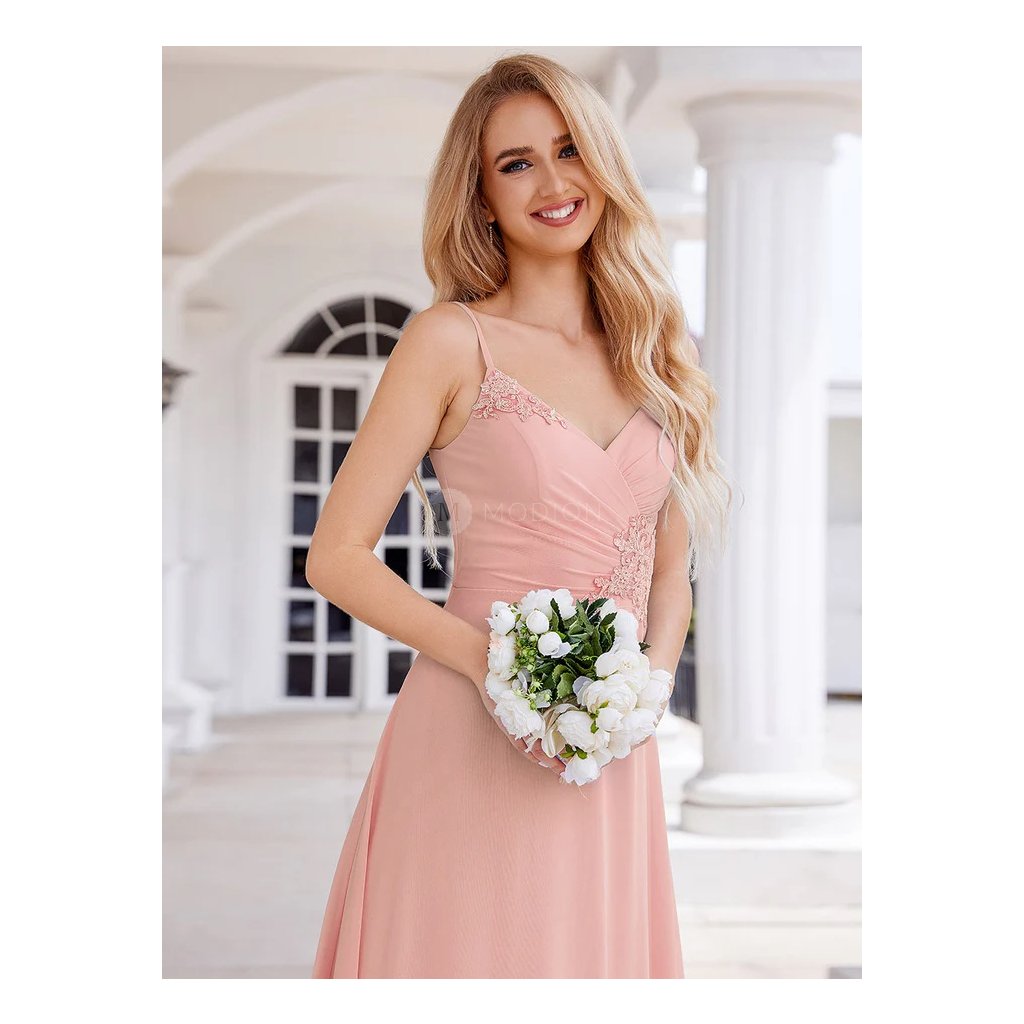 Dlouhé růžové společenské šaty v šifonovém provedení s krajkovým zdobením na tenká ramínka působí jemně, romanticky a velmi elegantně. Světlý růžový tón dodává modelu něžnost a ženský výraz, který je ideální pro slavnostní i večerní společenské události.