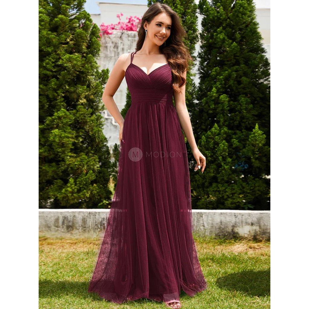 Dlouhé vínově červené společenské šaty působí elegantně, výrazně a velmi slavnostně. Jsou ideální volbou pro ženy, které hledají lehký večerní model s propracovaným zadním dílem a ženskou siluetou.