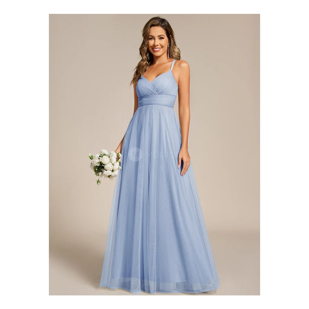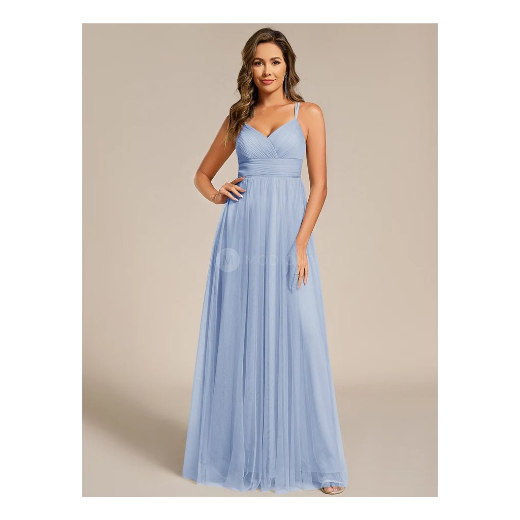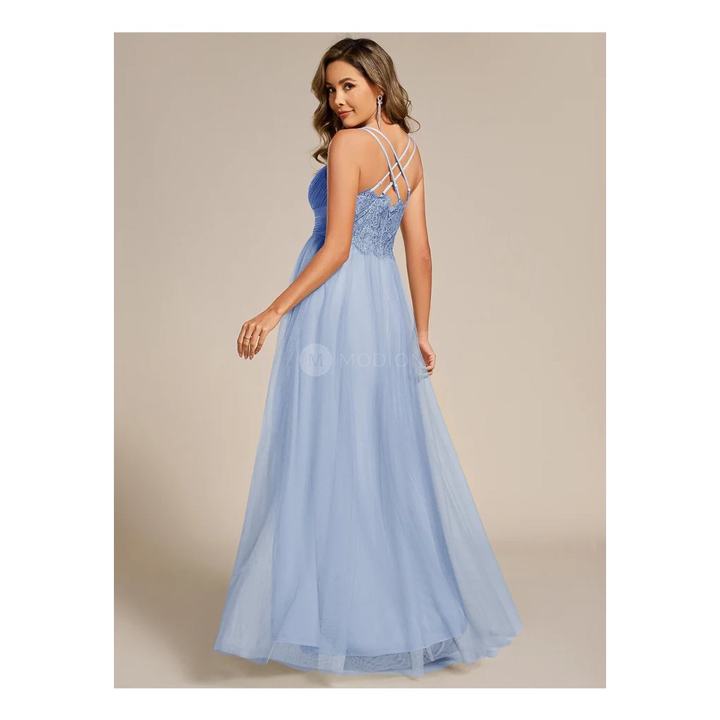 Dlouhé ledově modré společenské šaty působí jemně, svěže a velmi slavnostně. Jsou ideální volbou pro ženy, které hledají lehký a elegantní model s romantickým nádechem, zajímavým zadním detailem a vzdušnou siluetou.