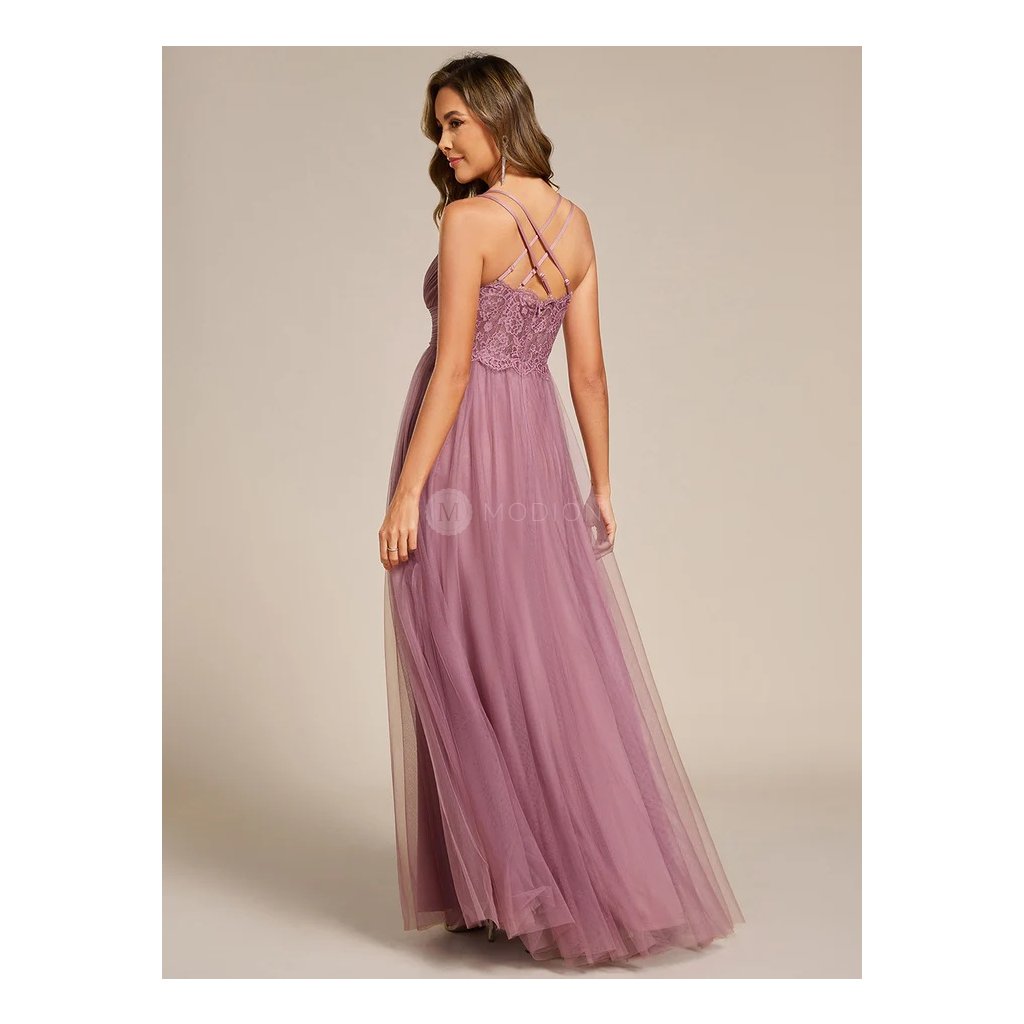 Starorůžové společenské šaty působí romanticky a něžně. Výstřih do V krásně zvýrazňuje dekolt, vyztužené poprsí zajišťuje komfort. Dvojitá ramínka překřížená na zádech v kombinaci s krajkovým zdobením tvoří atraktivní detail. Áčková tylová sukně se volně vlní a dodává šatům lehkost. Vhodné pro družičky, maturantky, svatební hosty i jako popůlnoční.
