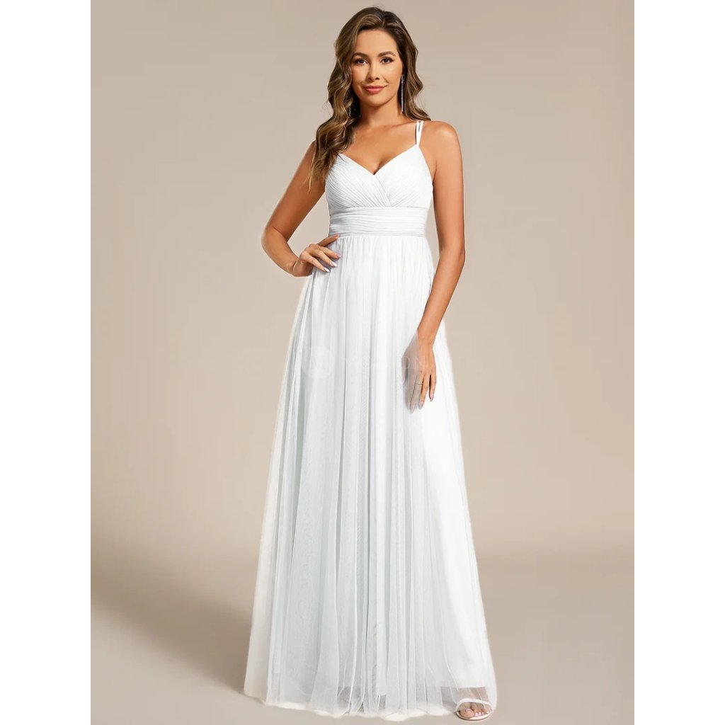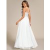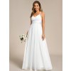 Bílé společenské šaty působí slavnostně a čistě. Výstřih do V zvýrazňuje dekolt, vyztužené poprsí dodává pohodlí a sebejistotu. Dvojitá ramínka se vzadu překříží a propojují se s krajkovým zdobením. Lehká tylová áčková sukně působí vzdušně a romanticky. Skvělá volba pro taneční, svatební obřad, plesy i jako popůlnoční svatební šaty.