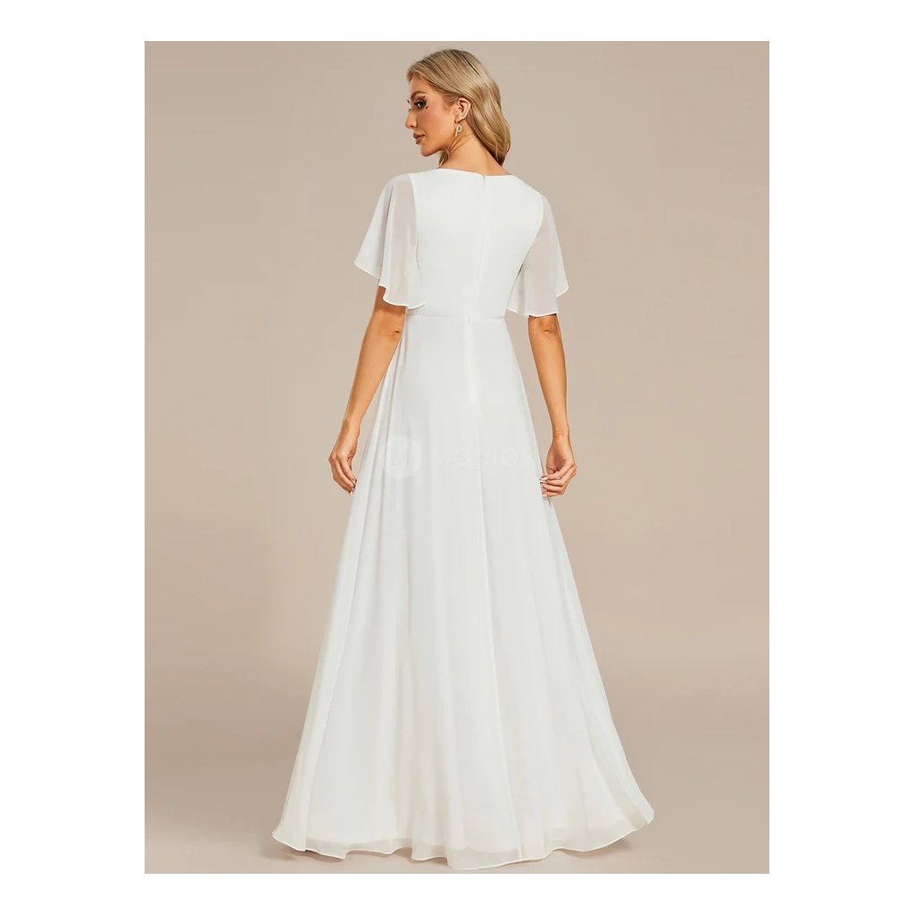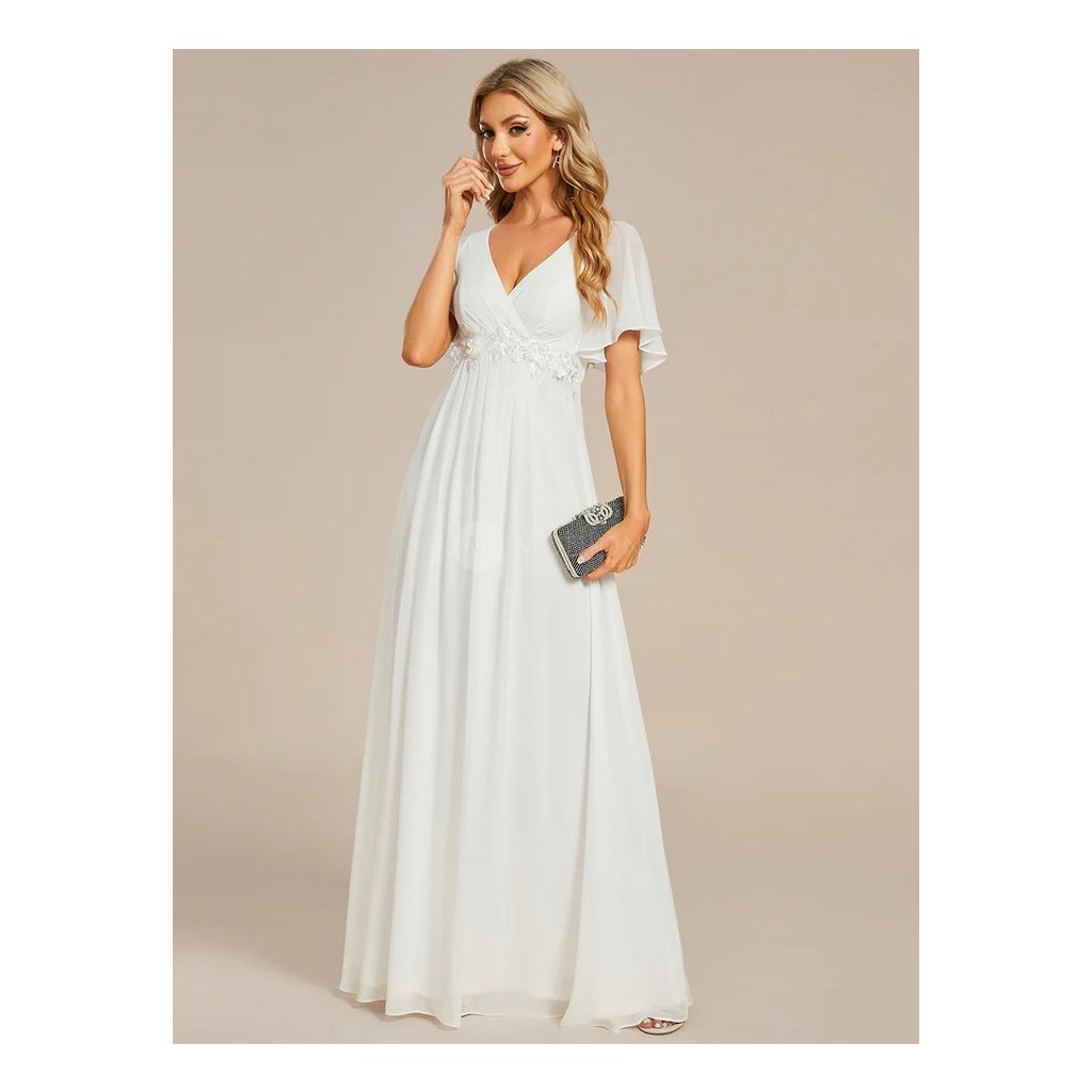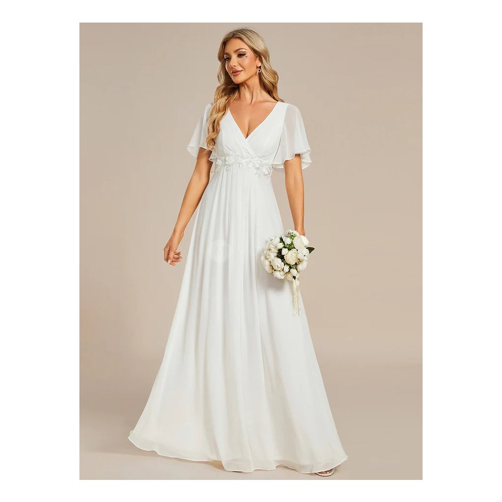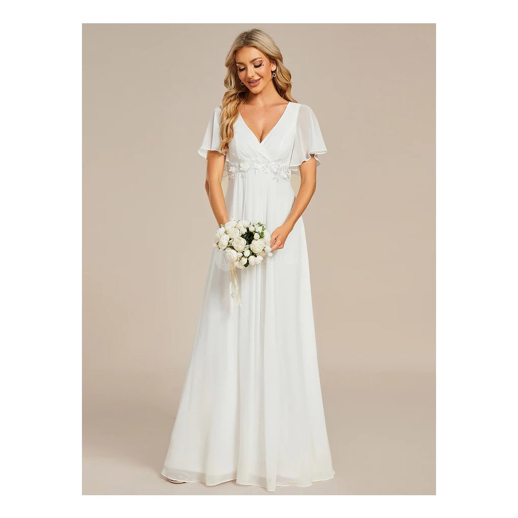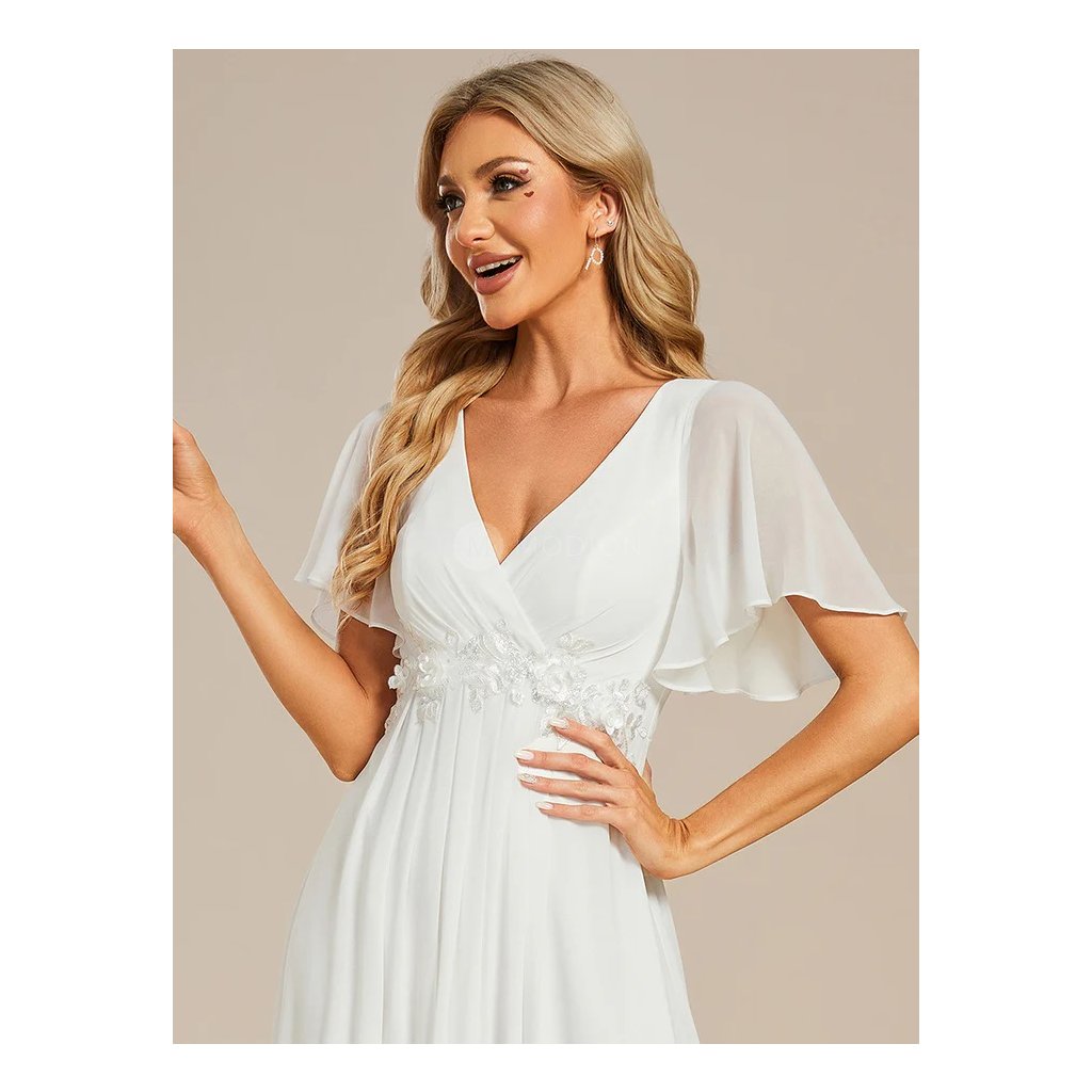 Lehký šifonový materiál dodává modelu vzdušnost a plynulý pohyb při chůzi i tanci. Výstřih do V krásně lichotí dekoltu a opticky prodlužuje siluetu, zatímco zdobený pas s jemnou krajkou zvýrazňuje linii postavy a přidává šatům něžný svatební detail. Krátké splývavé rukávy podtrhují lehký, romantický a elegantní vzhled. Dlouhá splývavá sukně vytváří harmonický a velmi vkusný svatební dojem.