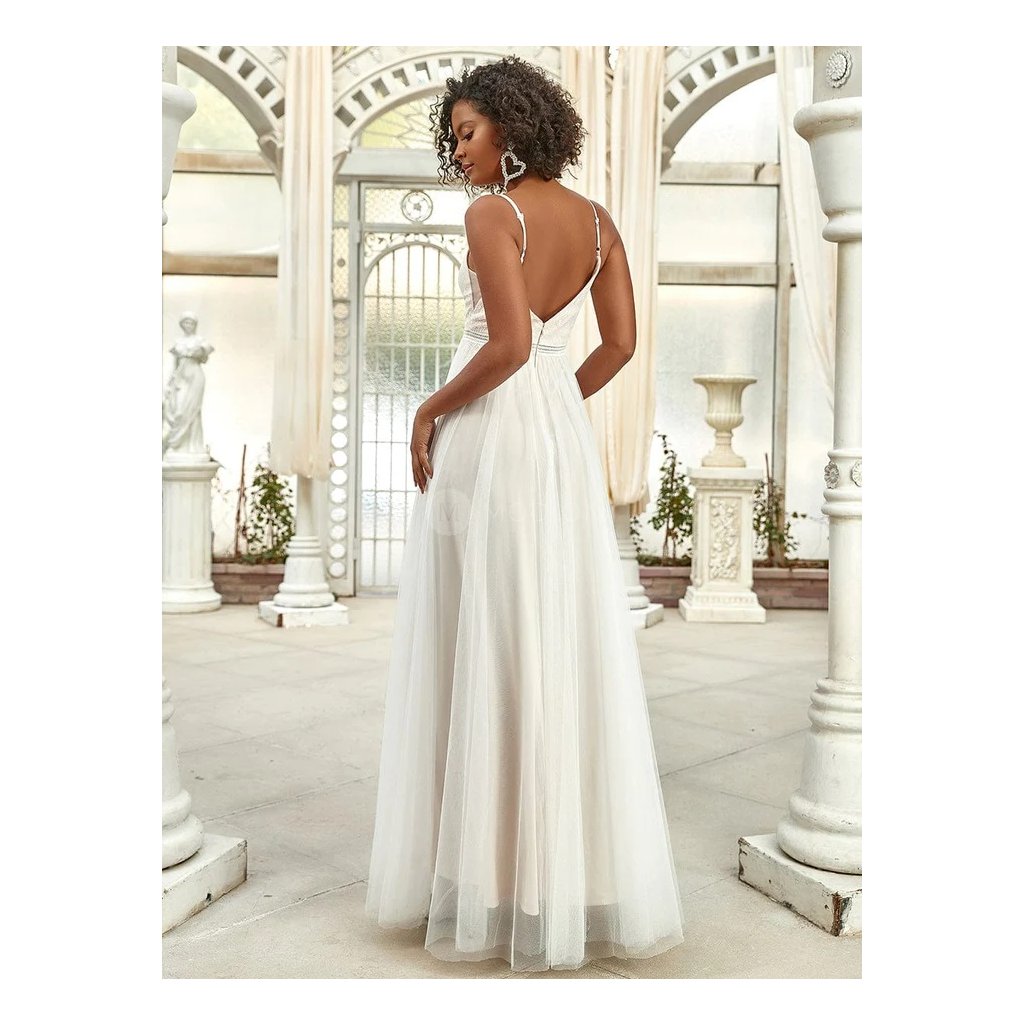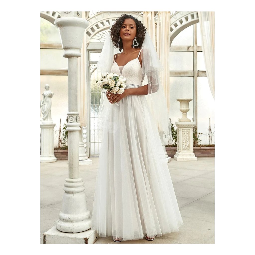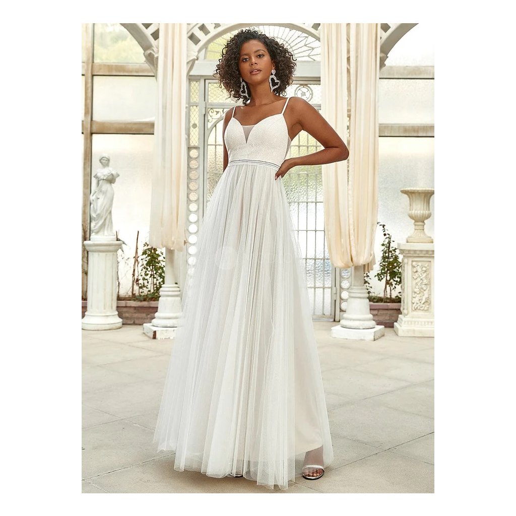 Lehký tylový materiál dodává šatům vzdušnost a ladný pohyb při chůzi i tanci. Krajkový živůtek na ramínka jemně tvaruje dekolt a zvýrazňuje siluetu, zatímco splývavá tylová sukně vytváří nadčasový svatební vzhled s decentním nádechem luxusu. Celek působí velmi žensky, jemně a slavnostně, aniž by byl okázalý.