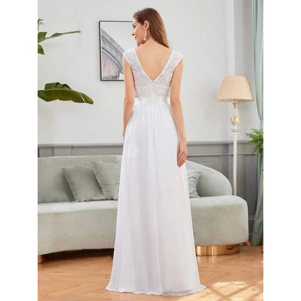 Společenské šaty Belén: Dlouhé bílé šifonové s krajkovým živůtkem na ramínka, ideální na svatební obřad i hostinu.