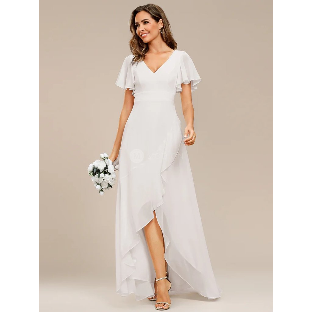 Dlouhé svatební šaty ve svatební bílé barvě působí jemně, romanticky a velmi elegantně. Lehký šifon se při chůzi krásně vlní a dodává šatům lehkost, vzdušnost i něžně splývavý efekt. Asymetrická sukně s volánkovým lemem opticky prodlužuje postavu a vytváří ladnou siluetu, která se skvěle hodí pro svatební obřad pod širým nebem, v zahradě i na radnici.